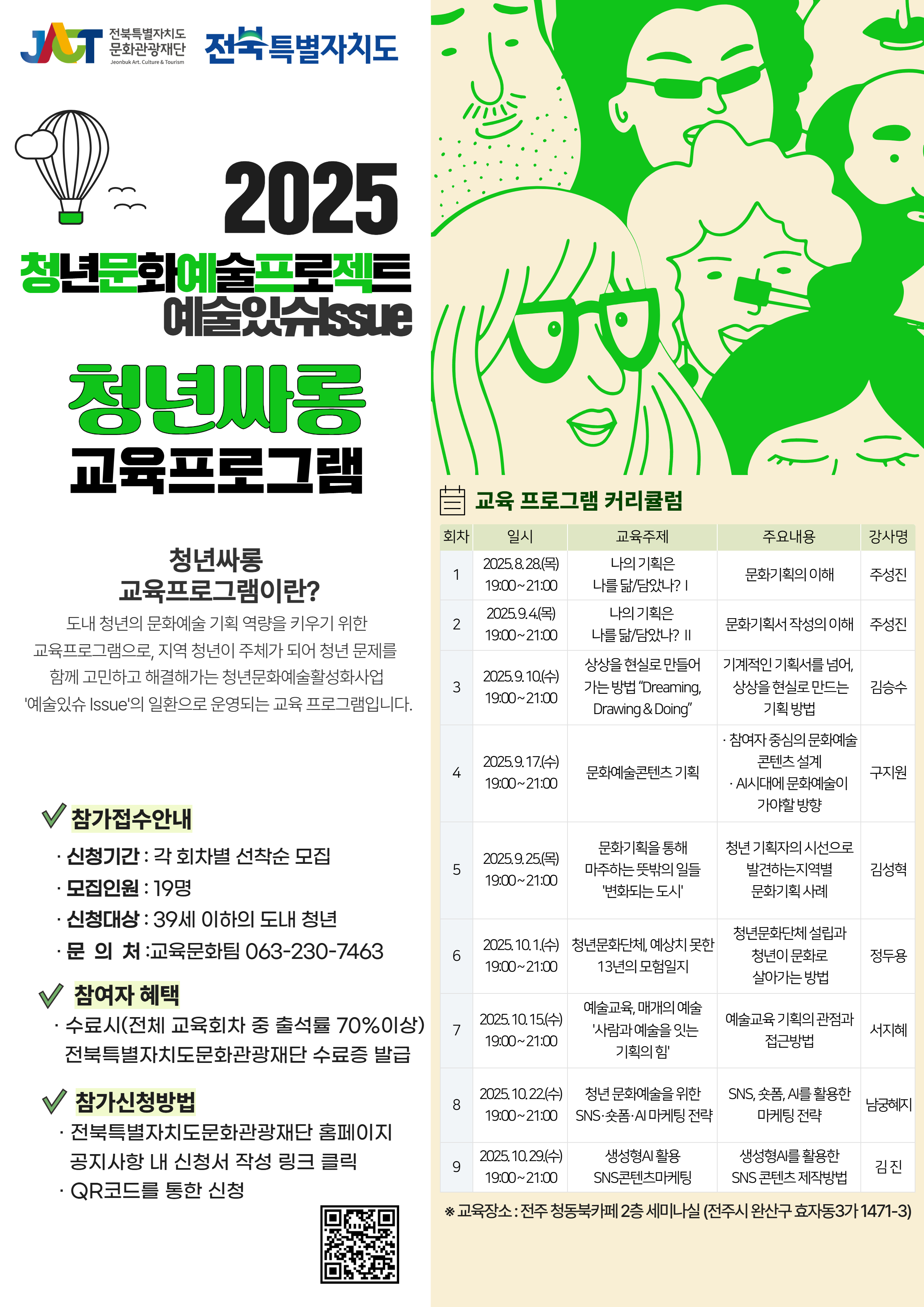 전북문화관광재단에서 2025 청년문화예술프로젝트 예술있슈 Issue ‘청년싸롱 - 2회차’ 교육 프로그램을 운영합니다. 관심있는 학생들은 많은 참여 바랍니다.