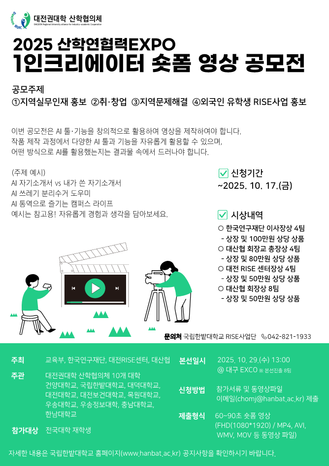 국립한밭대학교에서 2025 산학연협력 EXPO 1인크리에이터 숏폼 영상 공모전을 개최합니다. 관심있는 학생들은 많은 참여 바랍니다.