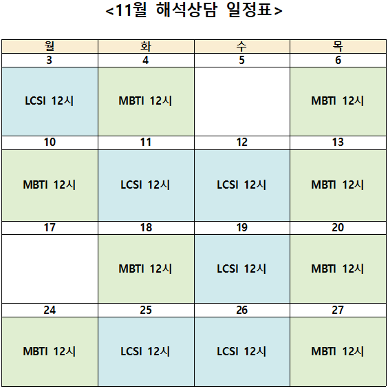 ○ 12월 심리검사 신청 일정은 11월 넷째주 월요일(11/17) 오후에 확인할 수 있습니다.