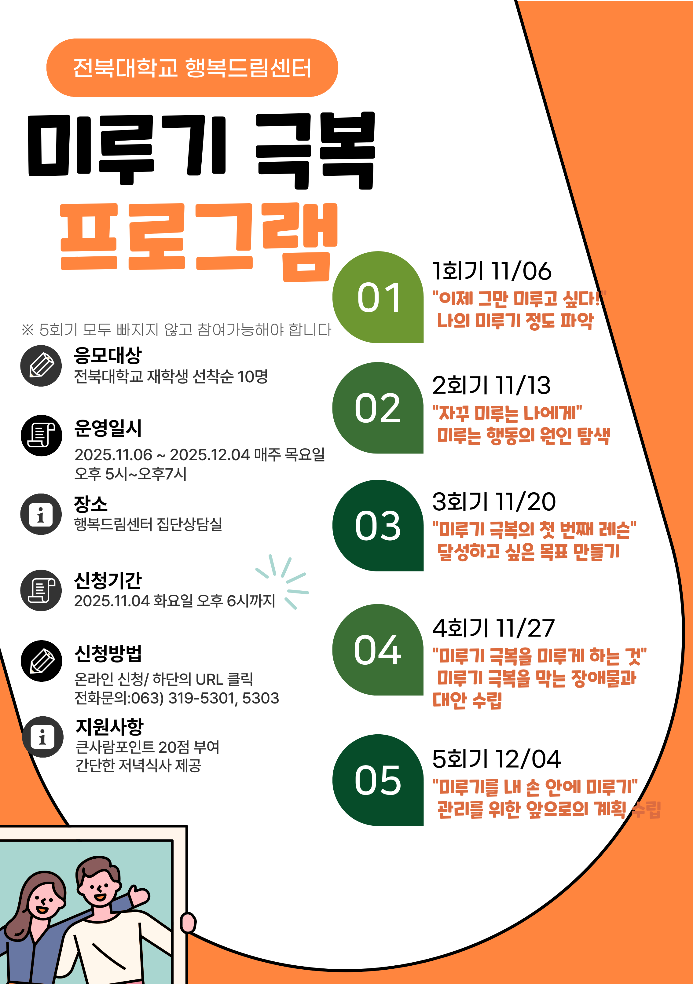 - 신청방법 : 행복드림센터 홈페이지 신청, 미루기 극복 집단상담 신청하러 가기
