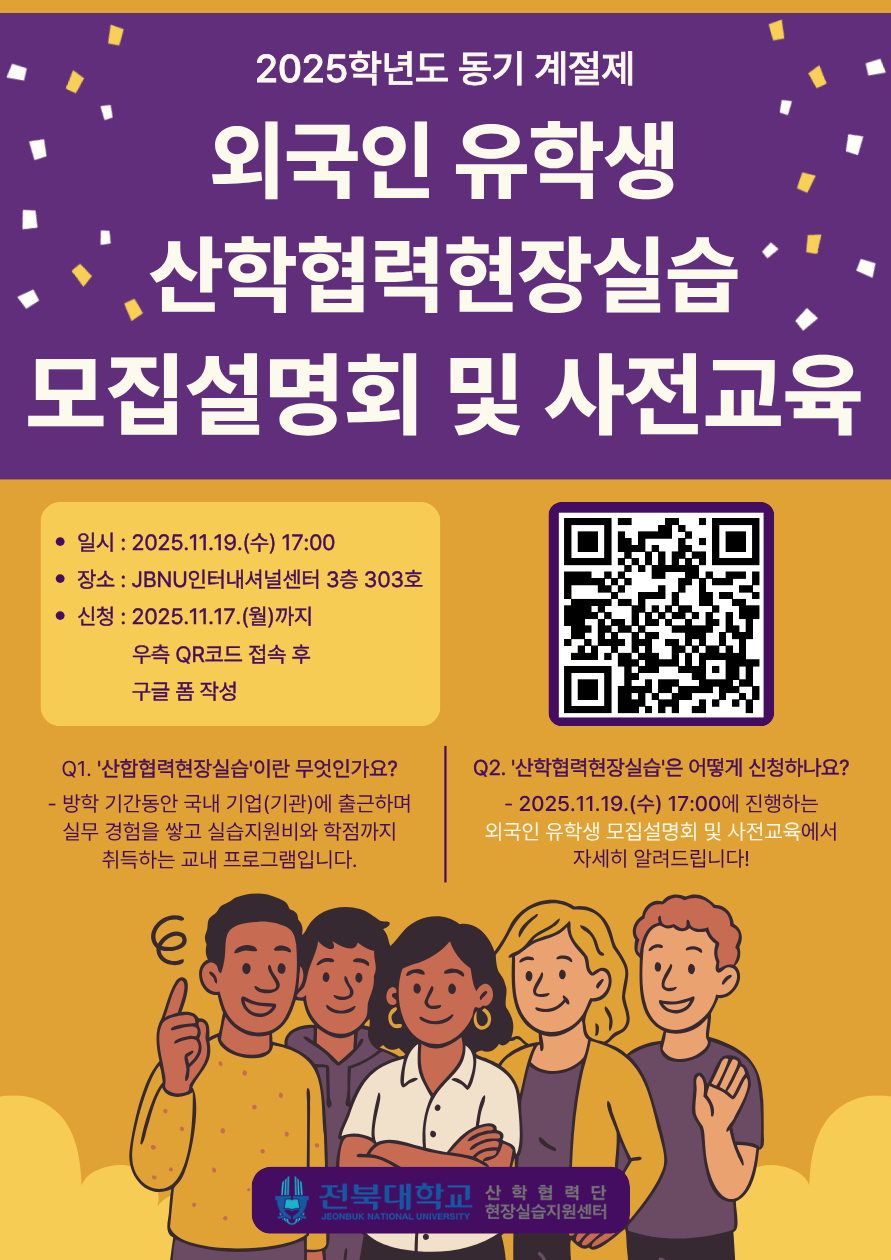 [현장실습지원센터] 2025학년도 동기 계절제 외국인 유학생 산학협력현장실습 모집설명회 및 사전교육 안내