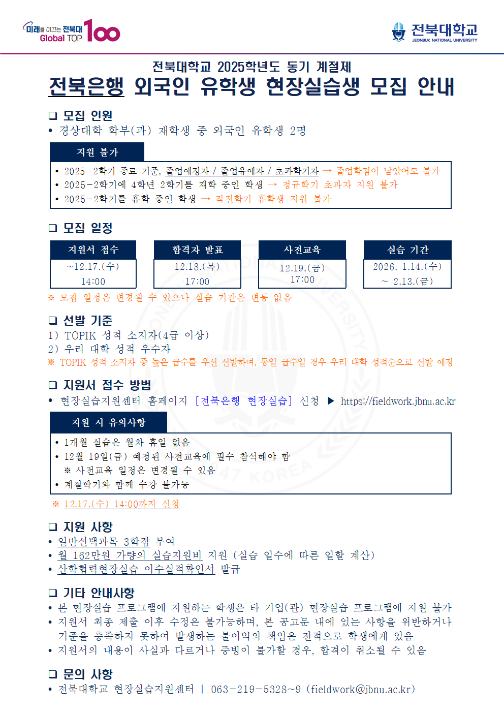 [현장실습지원센터]2025학년도 동기 계절제 외국인 유학생 전북은행 산학협력현장실습 실습생 모집 안내 (12.17.(수) 14:00 마감)