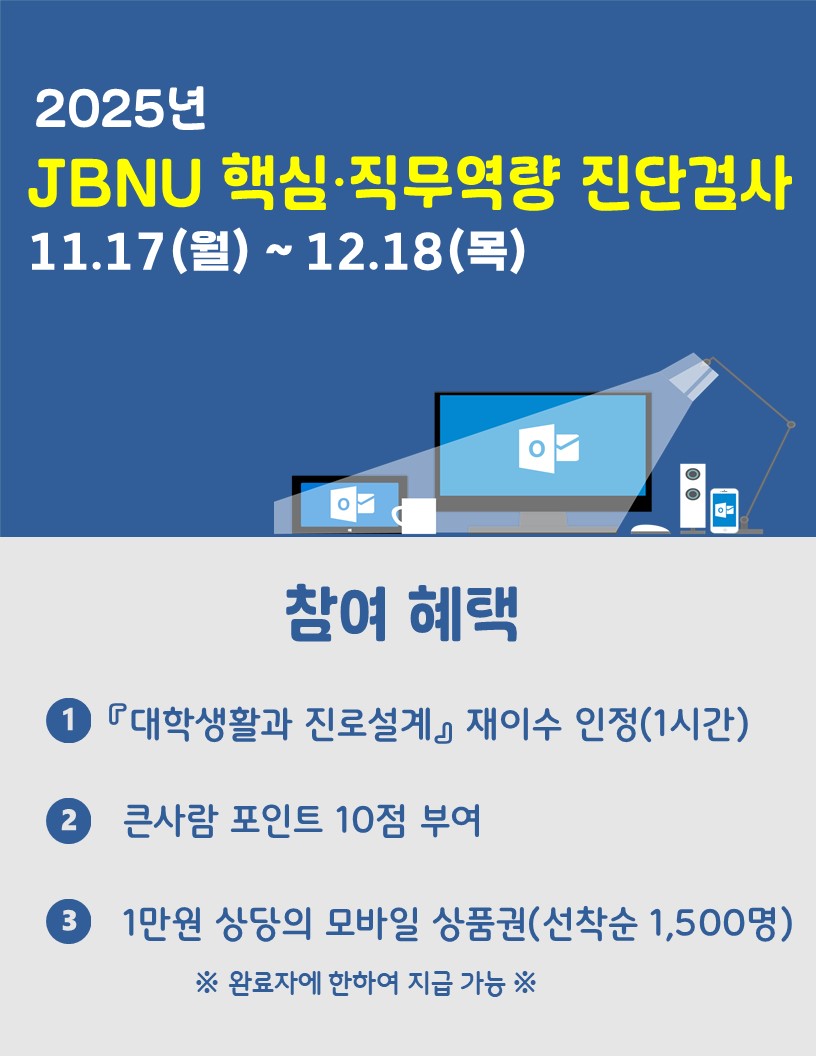 2025 학년도 JBNU 핵심 ‧직무역량 진단검사 를 아래와 같이 실시하오니 , 대학생이 갖추어야 할 핵심역량 진단 기업에서 요구하는 직무능력을 점검하고자 하는  재학생 여러분들의 많은 참여바랍니다 .
