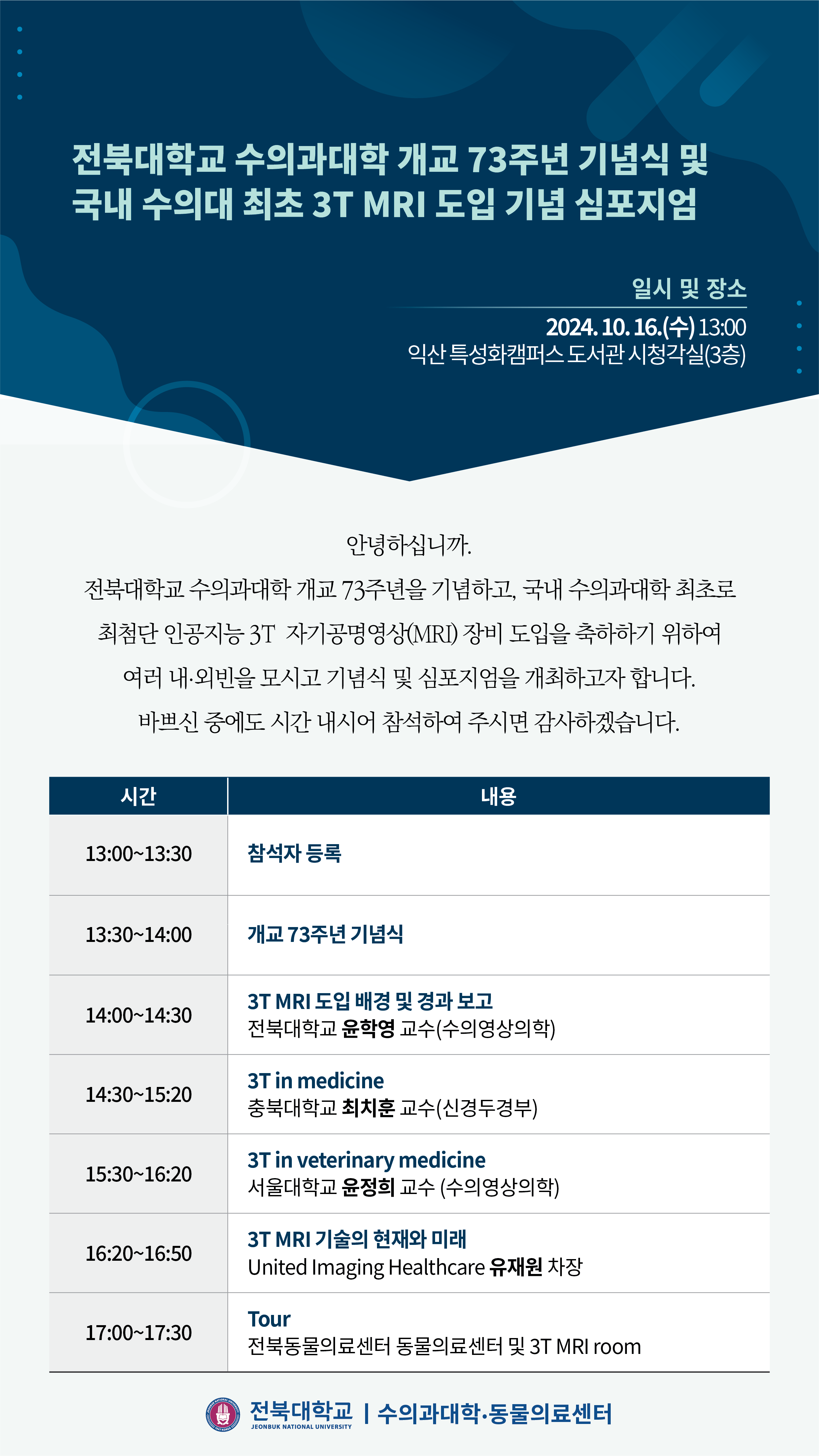 3T MRI 도입배경 및 경과보고를 시작으로 서울대 및 충북대 등 수의영상의학 분야 석학들이 초청돼 최신 연구 동향을 공유하고, 국내 수의영상의학 수준을 세계적 수준으로 도약하기 위한 선포의 자리가 될 것이다.
