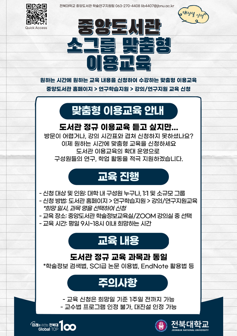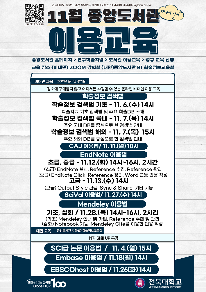 3. 교육문의: 중앙도서관 학술연구지원팀 (270-4408, lib4407@jbnu.ac.kr)