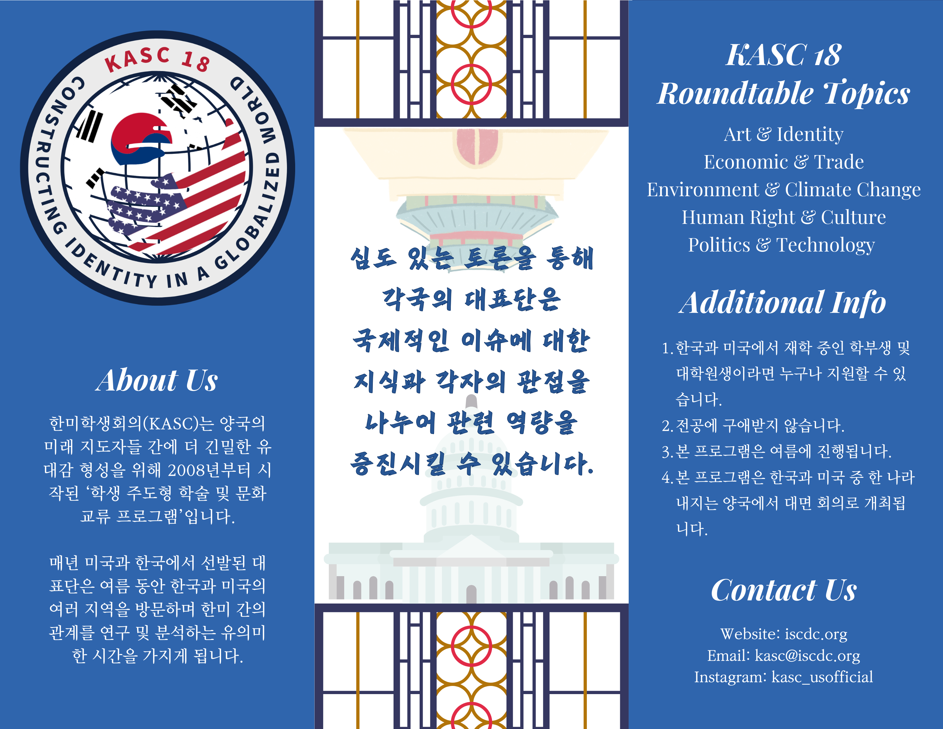 한미 양국의 대표로 선발된 총 20명의 대표단은 2025년 7월, 약 2주간 서울과 뉴욕에서 컨퍼런스를 진행할 예정입니다. 이번 KASC 18의 주제는 Constructing Identity in a Globalized World입니다. 이 주제를 기반으로 5개의 소주제를 통해 한미관계에 있어서 각각의 주제 등에 대해 협력할 수 있는 방안들을 모색할 뿐만 아니라, 국제 사회에서 정체성을 확립할 수 있는 방법 등에 대한 연사 강연 및 심층적인 토론이 진행됩니다. 자세한 내용은 첨부파일과 공식 홈페이지를 참고해주시기 바랍니다.