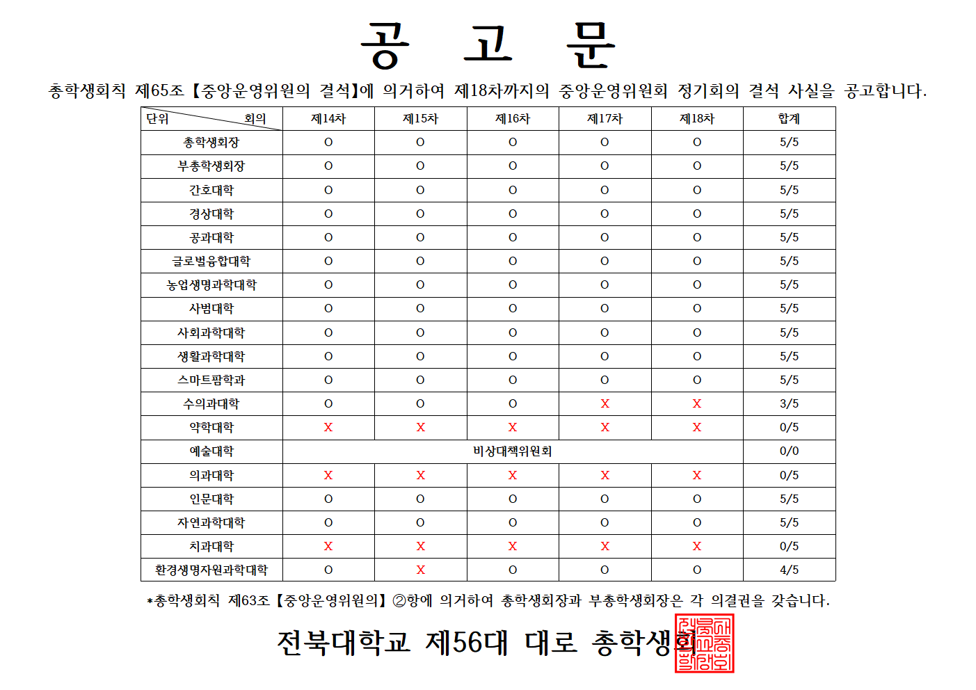 총학생회칙 제65조 【중앙운영위원의 결석】에 의거하여 제13차까지의 중앙운영위원회 정기회의 결석 사실을 공고합니다.