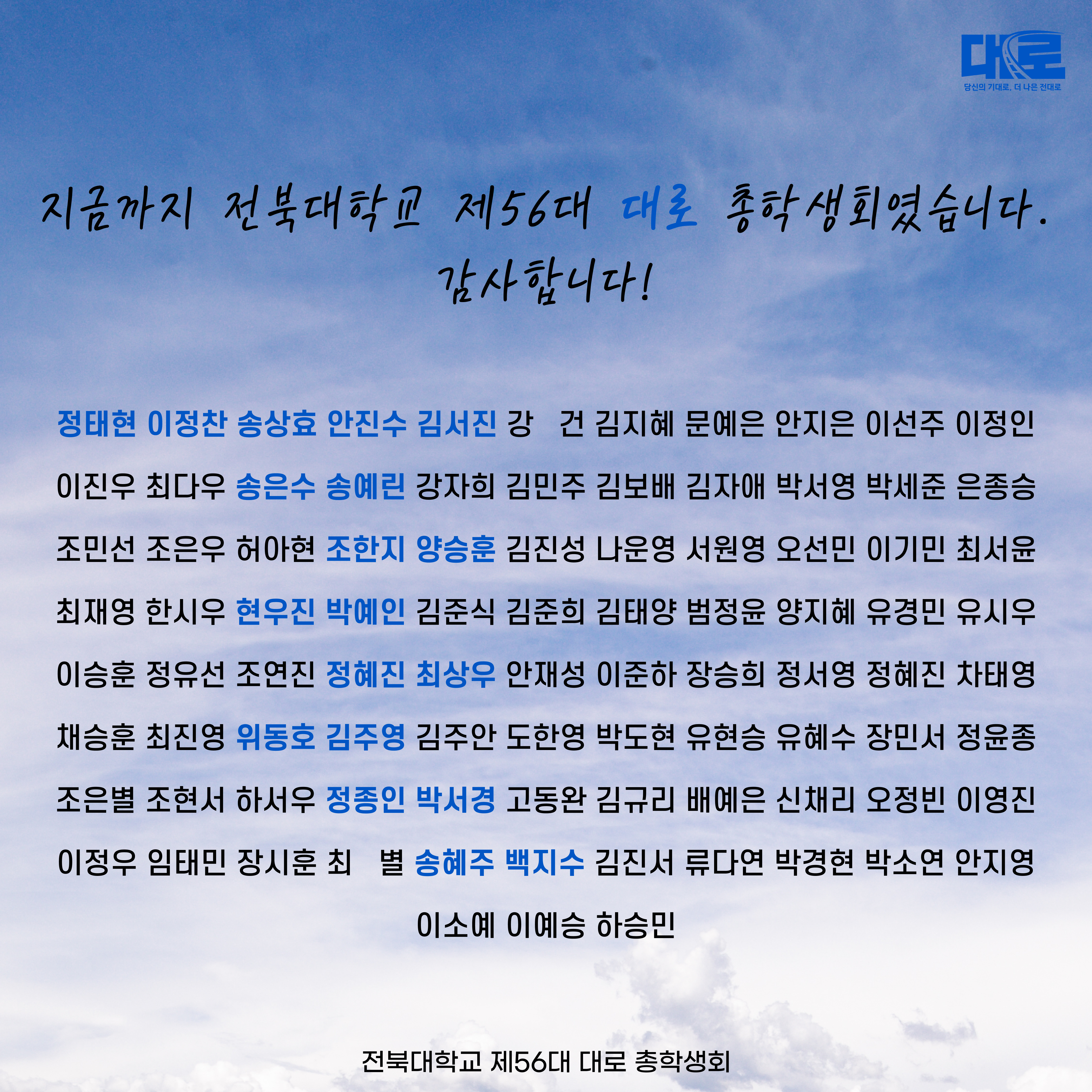 지금까지 학우님들의 기대로, 더 나은 전대로 향하는 전북대학교 제56대 대로 총학생회였습니다. 감사합니다.