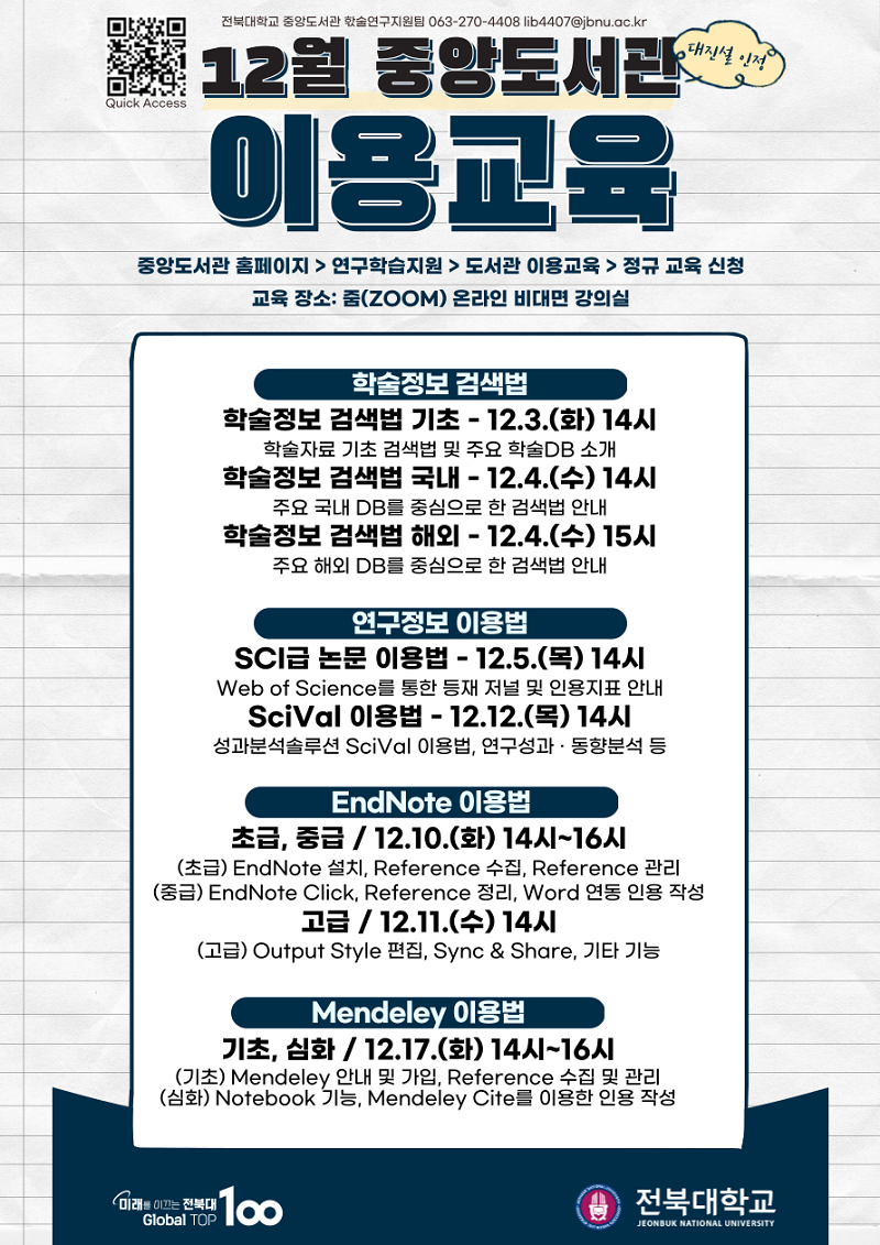 4. 교육문의: 중앙도서관 학술연구지원팀 (270-4408, lib4407@jbnu.ac.kr)