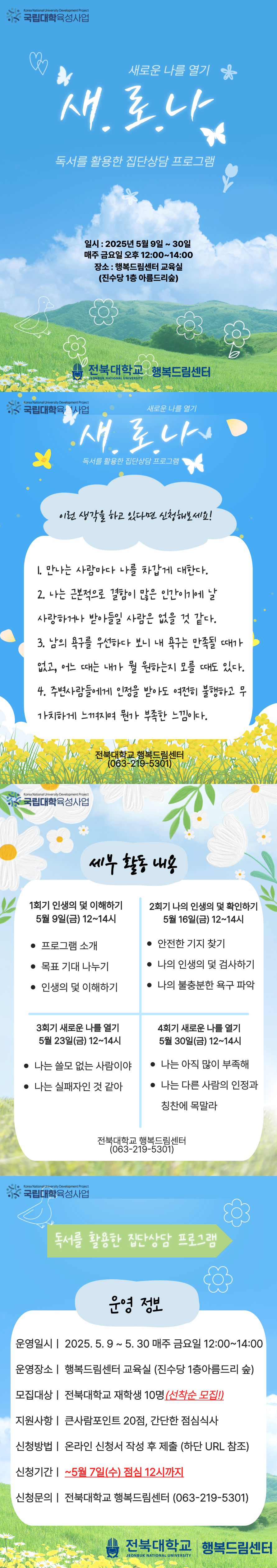 - 신청방법 : 행복드림센터 홈페이지 신청클릭 -> 전북대학교 행복드림센터 - 지원프로그램