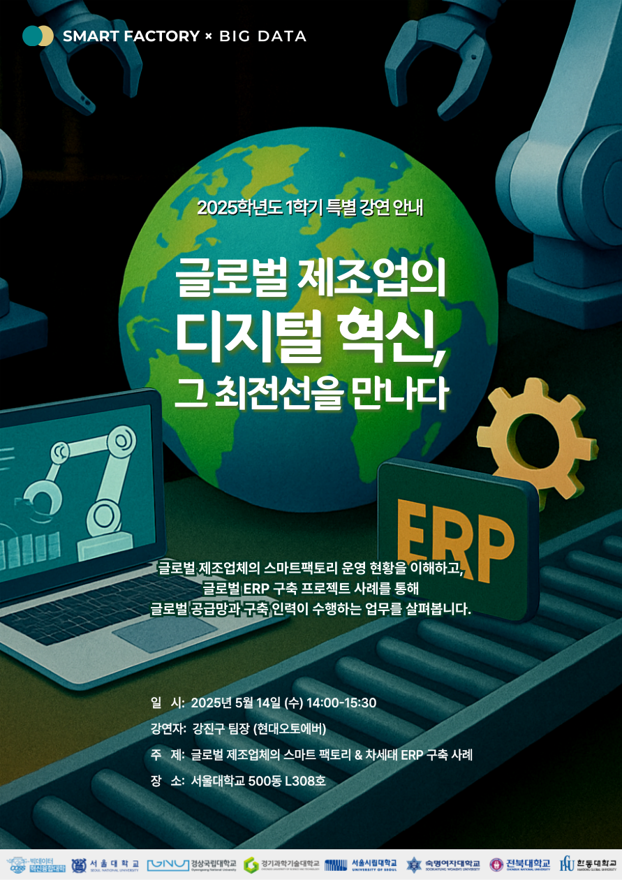 서울대학교 빅데이터 혁신융합대학사업단에서 스마트팩토리 특별 강연을 개최합니다.