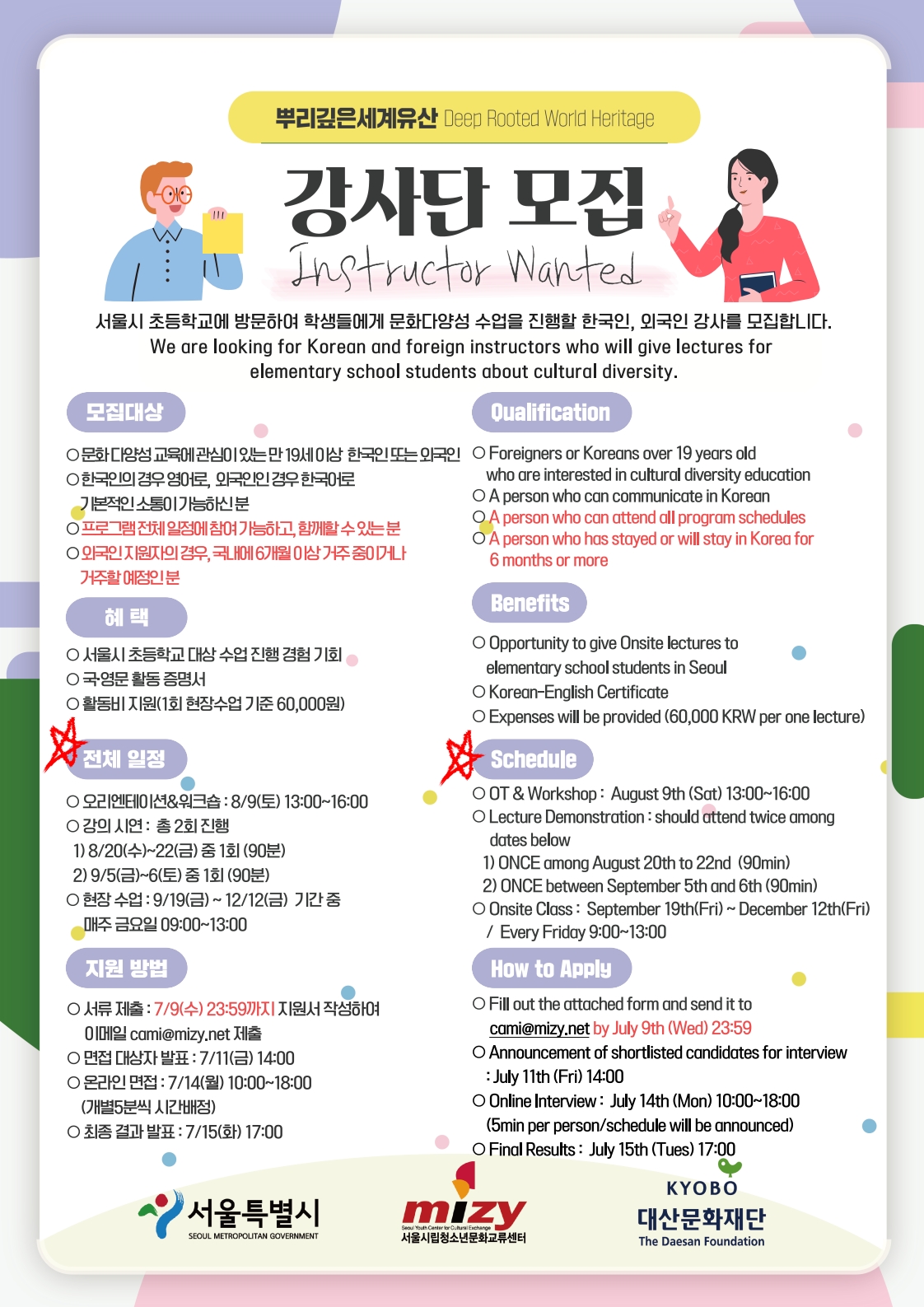 시립청소년문화교류센터에서 각국의 다양한 문화를 소개함으로써 청소년의 다문화 수용 능력을 증진시키기 위해 기획된 "뿌리깊은세계유산" 프로그램의 한국인 및 외국인 강사를 아래와 같이 모집하오니 관심있는 학생은 아래 포스터 및 붙임 문서를 참고해주시기 바랍니다.