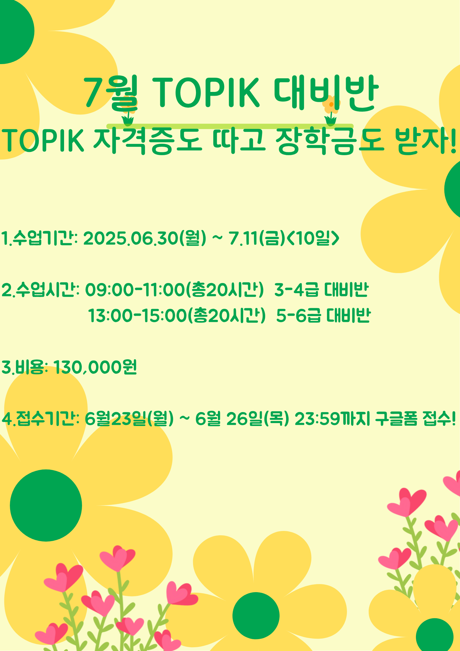๐ŸŽ“ 2025๋…„ 7์›”13์ผ TOPIK ๋Œ€๋น„๋ฐ˜ ์ˆ˜๊ฐ•์ƒ ๋ชจ์ง‘ ๐ŸŽ“
