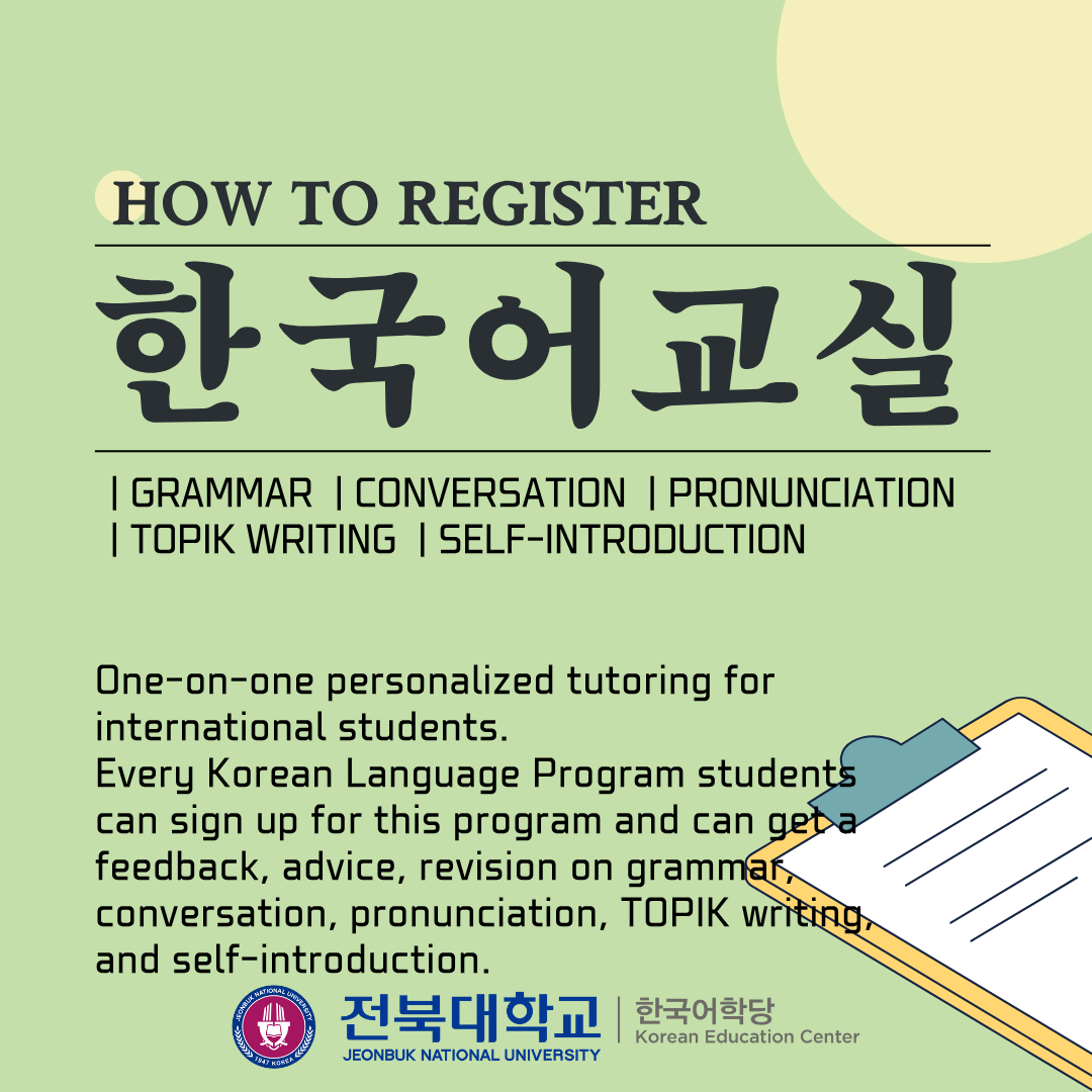 홈페이지 신청 https://top.jbnu.ac.kr/lec_korean/index.do → 한국어 교실 신청 클릭 ( 대면지도 1 일 전 23:59 까지 선착순 신청 ) → 신청 확인 ( 홈페이지 ) → 대면지도 장소 (JBNU 인터내셔널센터 내 강의실 , 추후 메일로 통보 예정 ) 방문