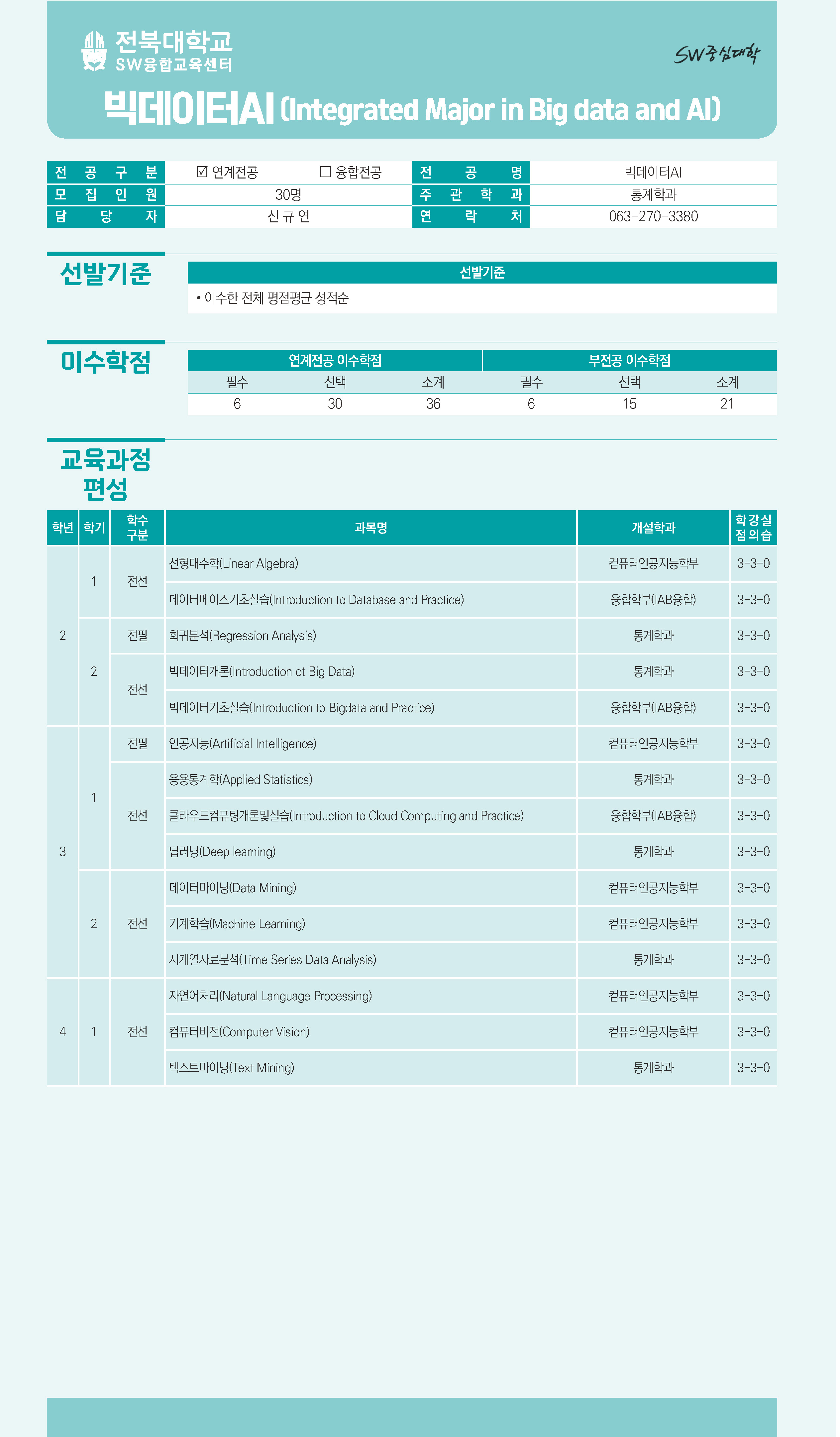 - SW연계전공: 공간정보AI, AI반도체, 스마트융합미디어학, 과학융합빅데이터, 빅데이터AI