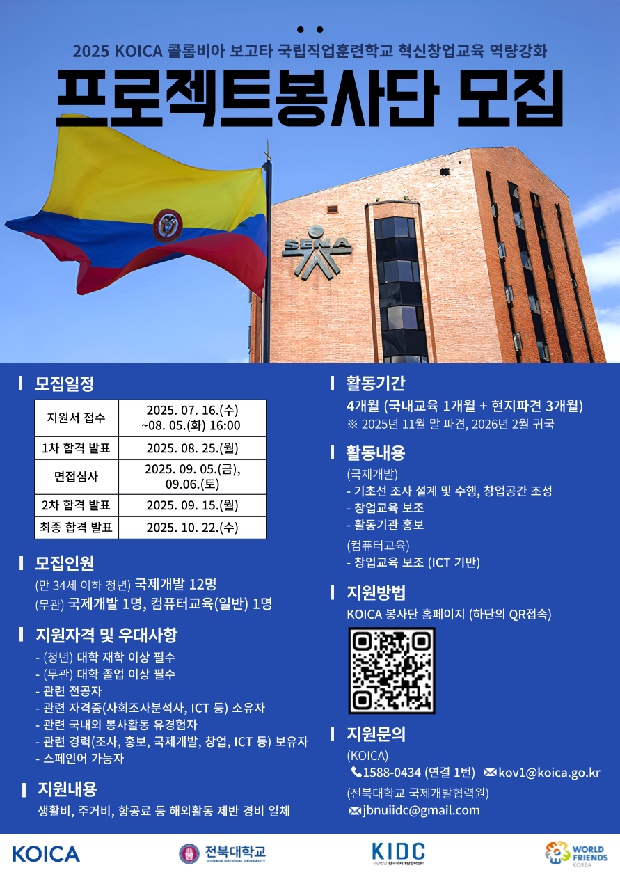 KOICA(한국국제협력단)와 전북대학교가 함께하는 『2025 콜롬비아 보고타 국립직업훈련학교 혁신창업교육 역량강화』 프로젝트와 관련하여, 국제개발협력 분야에 관심 있는 대학(원)생 여러분의 많은 참여를 바랍니다.