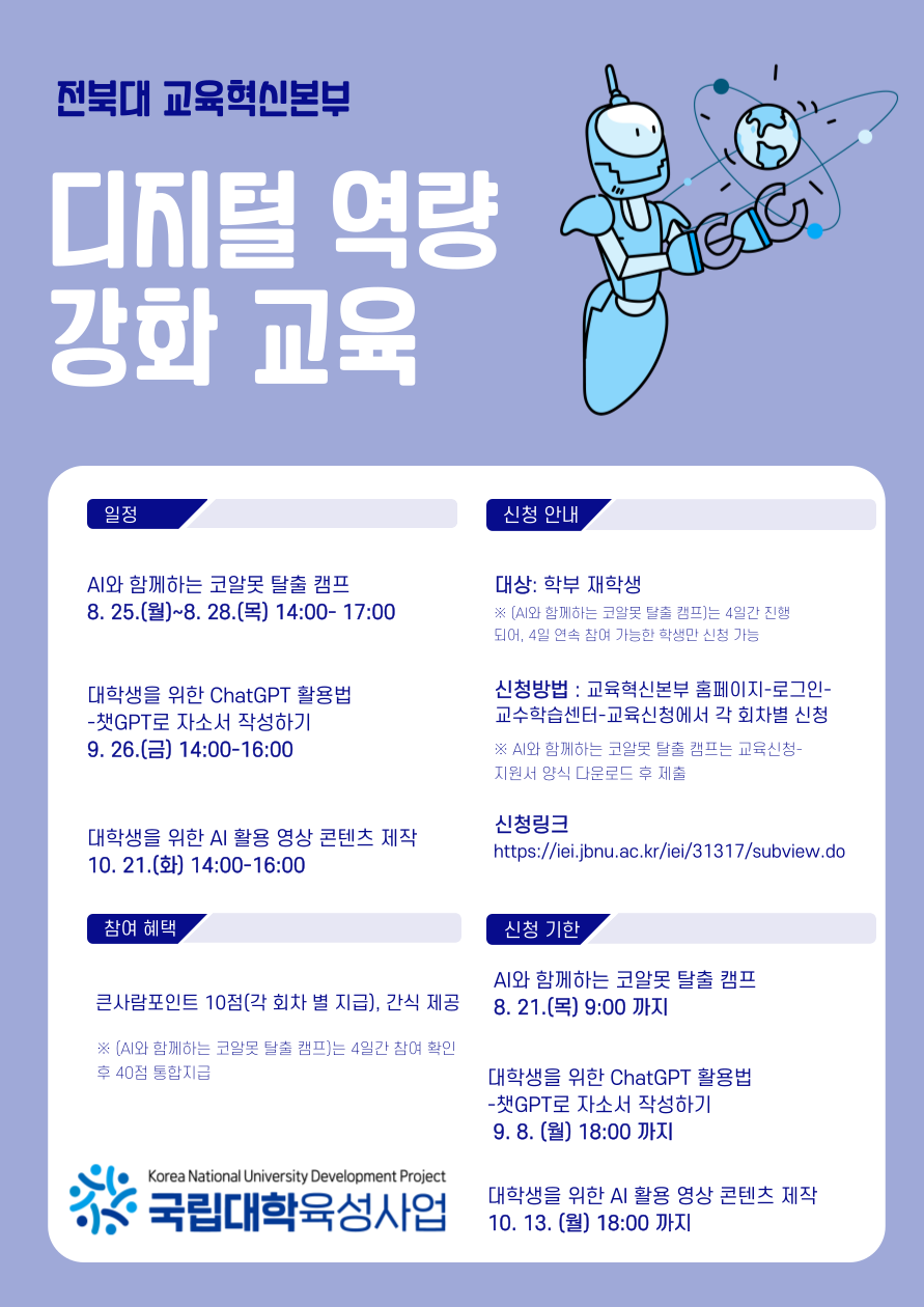 - 신청 링크: 교육혁신본부 신청 페이지(https://iei.jbnu.ac.kr/appProgram/iei/list.do)
