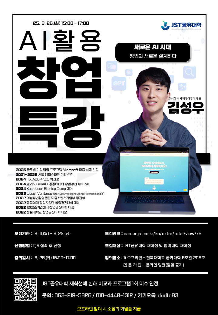 1) JST공유대학 경력관리시스템(비교과프로그램) 홈페이지 신청: https://career.jst.ac.kr/ko/extra/innovation/view/75