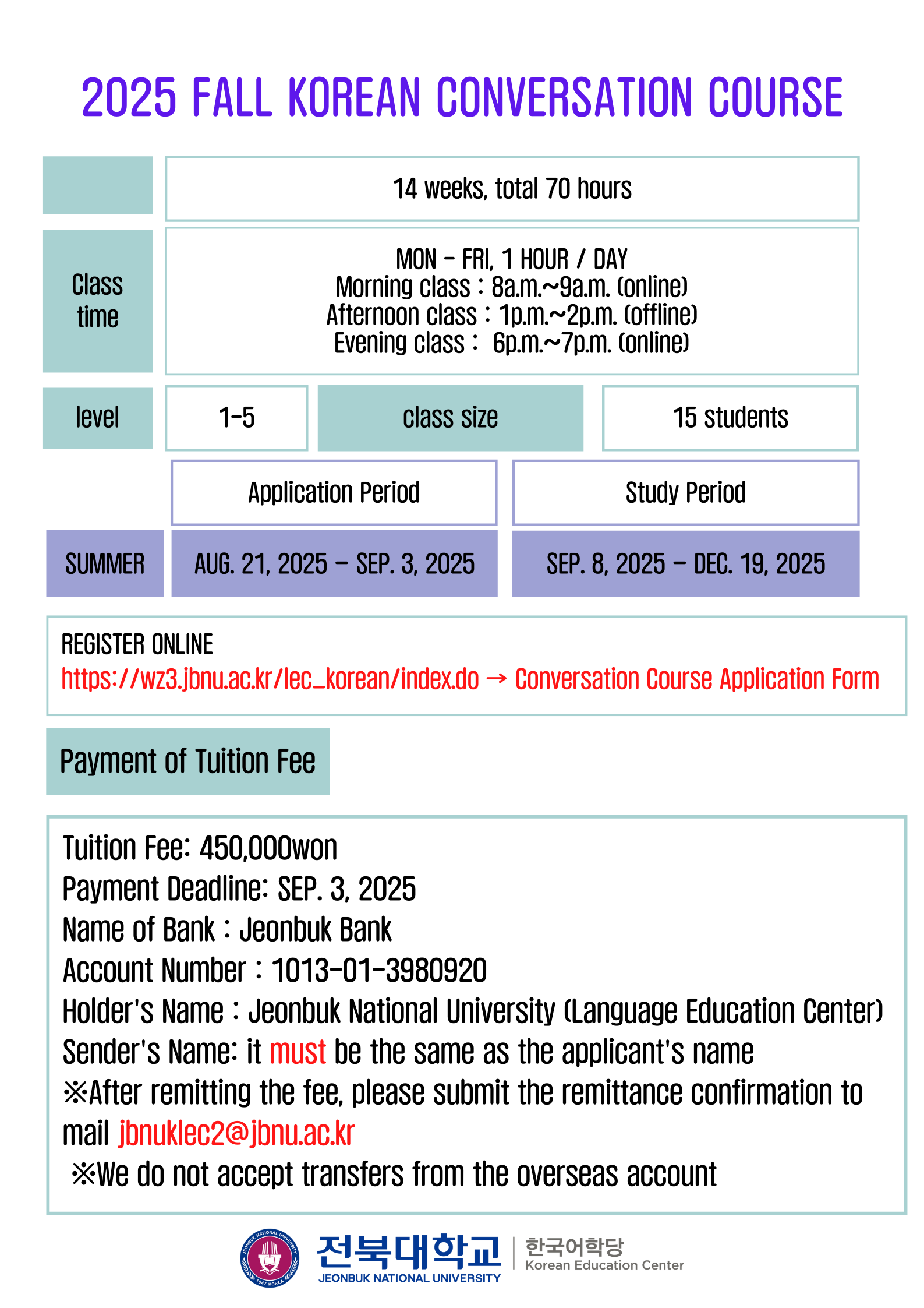 ※ After completing the payment, please send the receipt to our email: jbnuklec2@jbnu.ac.kr
