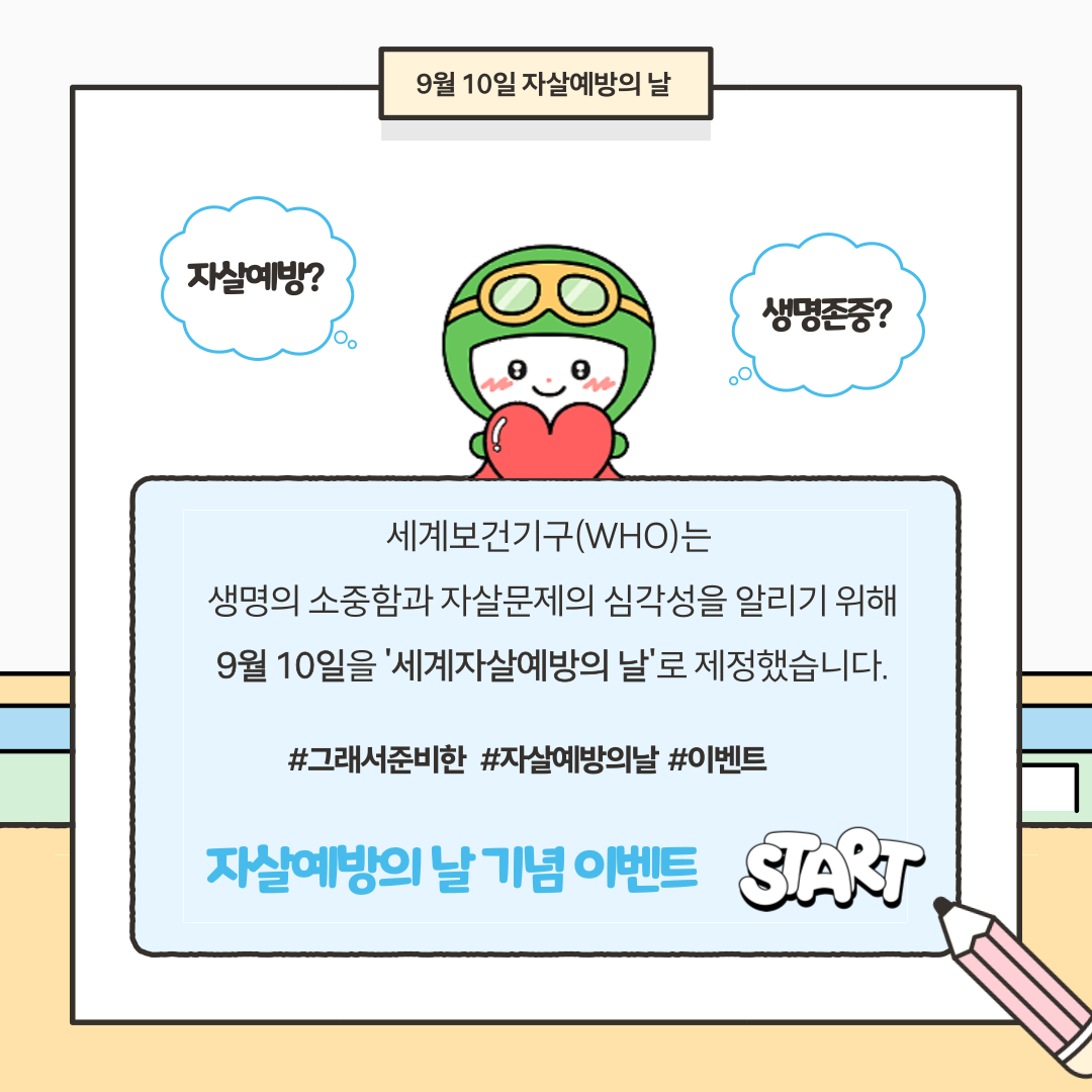 9์›” 10์ผ์€ ์„ธ๊ณ„ ์ž์‚ด์˜ˆ๋ฐฉ์˜ ๋‚ ์ž…๋‹ˆ๋‹ค.