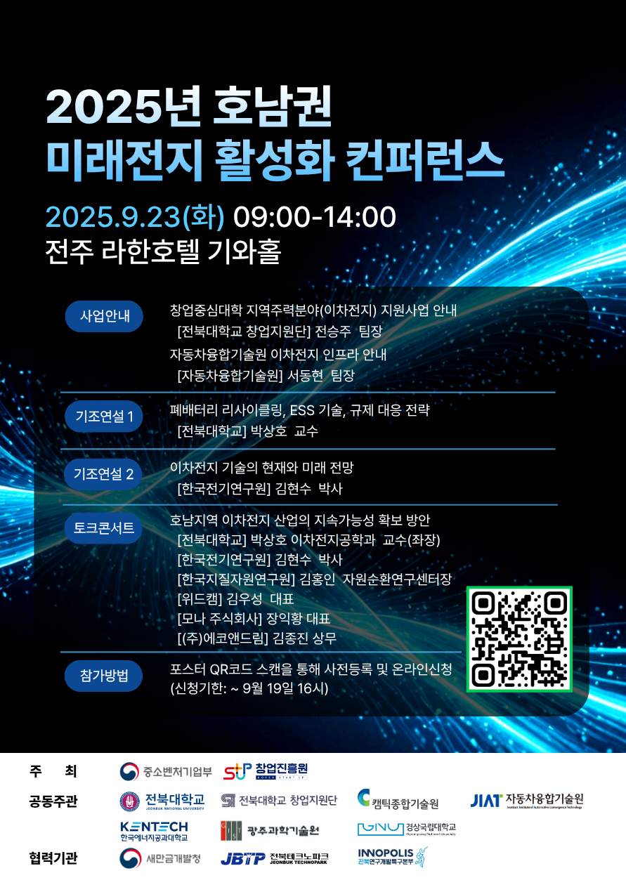 전북대학교 창업지원단에서 호남권역의 고부가가치 미래 산업을 선도하기 위한 미래전지 산업 활성화를 위한 컨퍼런스 운영을 하고자 합니다. 관심있는 학생 및 교직원께서는 많은 관심과 참여 부탁드립니다