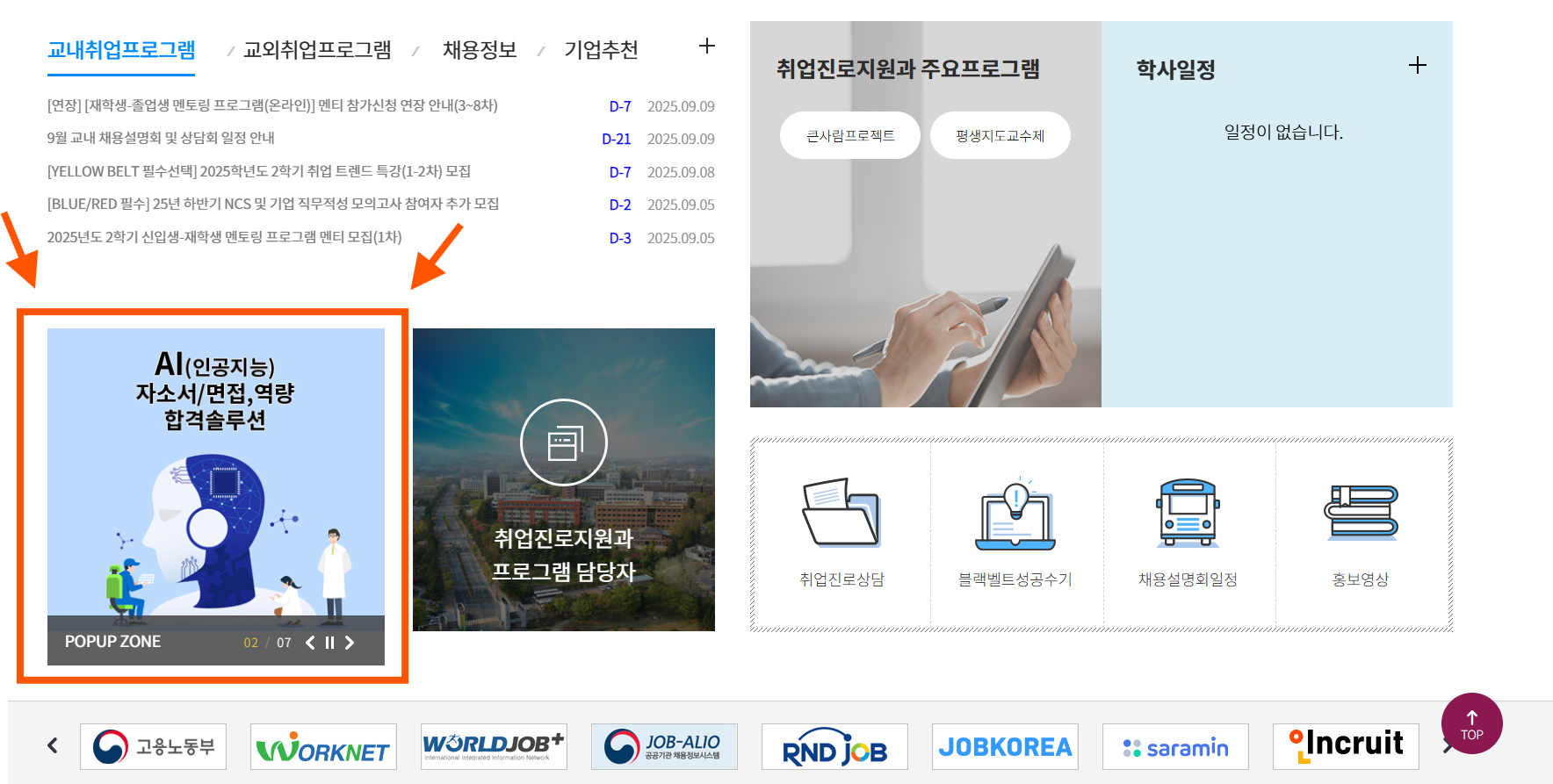 * 이용방법: 전북대학교 취업진로지원과 홈페이지 로그인 > AI 자소서/면접 합격솔루션 배너 클릭(아래 사진 참고)