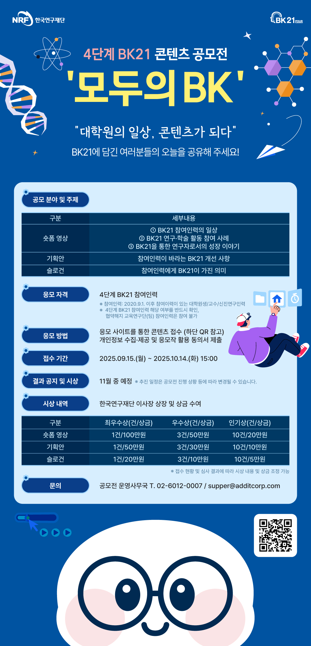 한국연구재단에서는 대학원생들의 일상과 연구활동을 공유하고 확산하기 위해 4단계 BK21 콘텐츠 공모전 「모두의 BK」를 개최합니다.