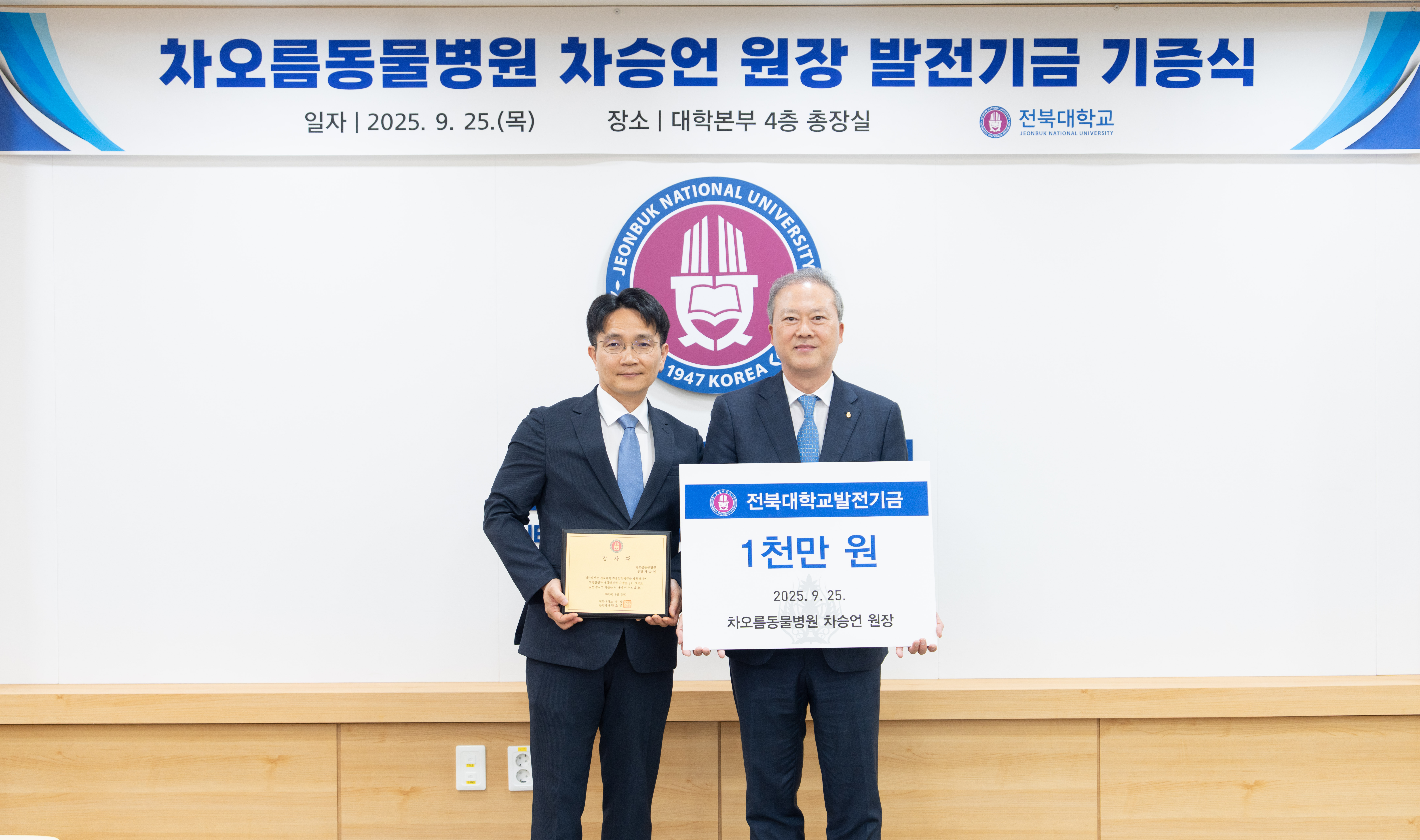 전북대는 이날 대학본부 총장실에서 양오봉 총장과 주요 보직자, 차승언 원장이 참석한 가운데 기증식을 열고 감사패를 전달했다.