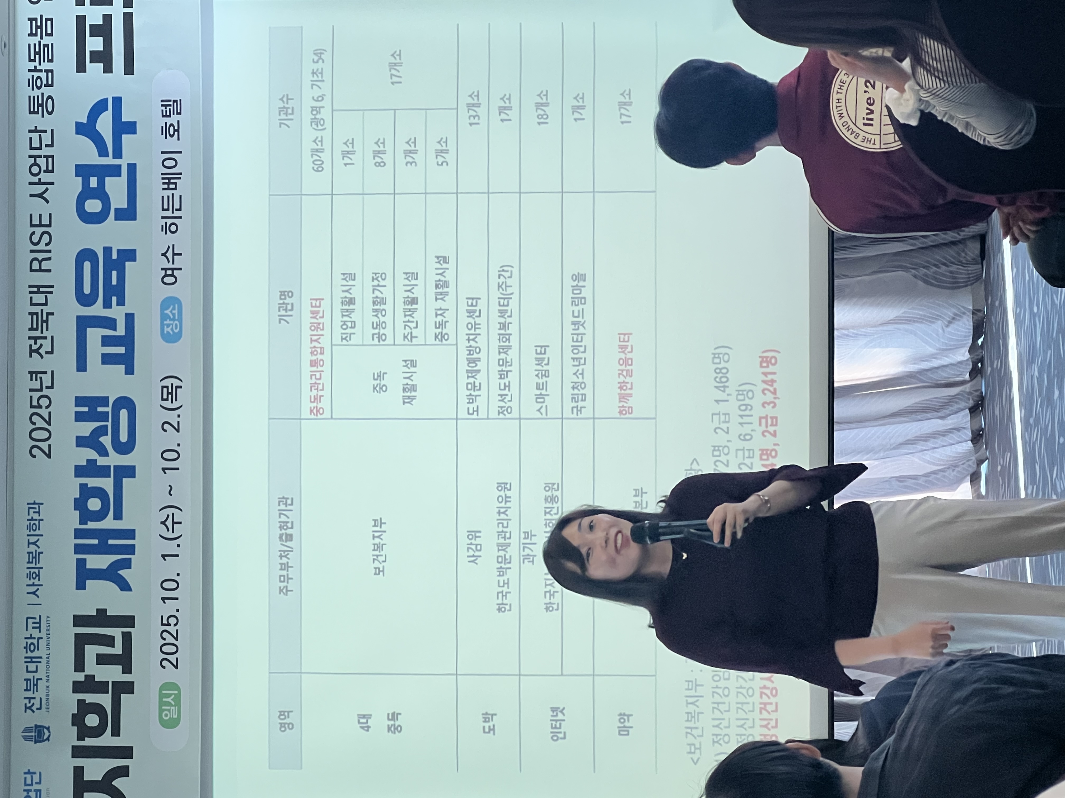 전북대 사회복지학과는 지난 10월 1일부터 2일까지 이틀간 여수에서 ‘통합돌봄 인력양성 재학생 교육 연수’를 진행했다고 13일 밝혔다. 교육부 및 전북특별자치도의 지역혁신중심 대학지원(RISE) 사업의 일환으로 열린 이번 연수에는 정규형 교수와 재학생 40여 명이 참여했다.
