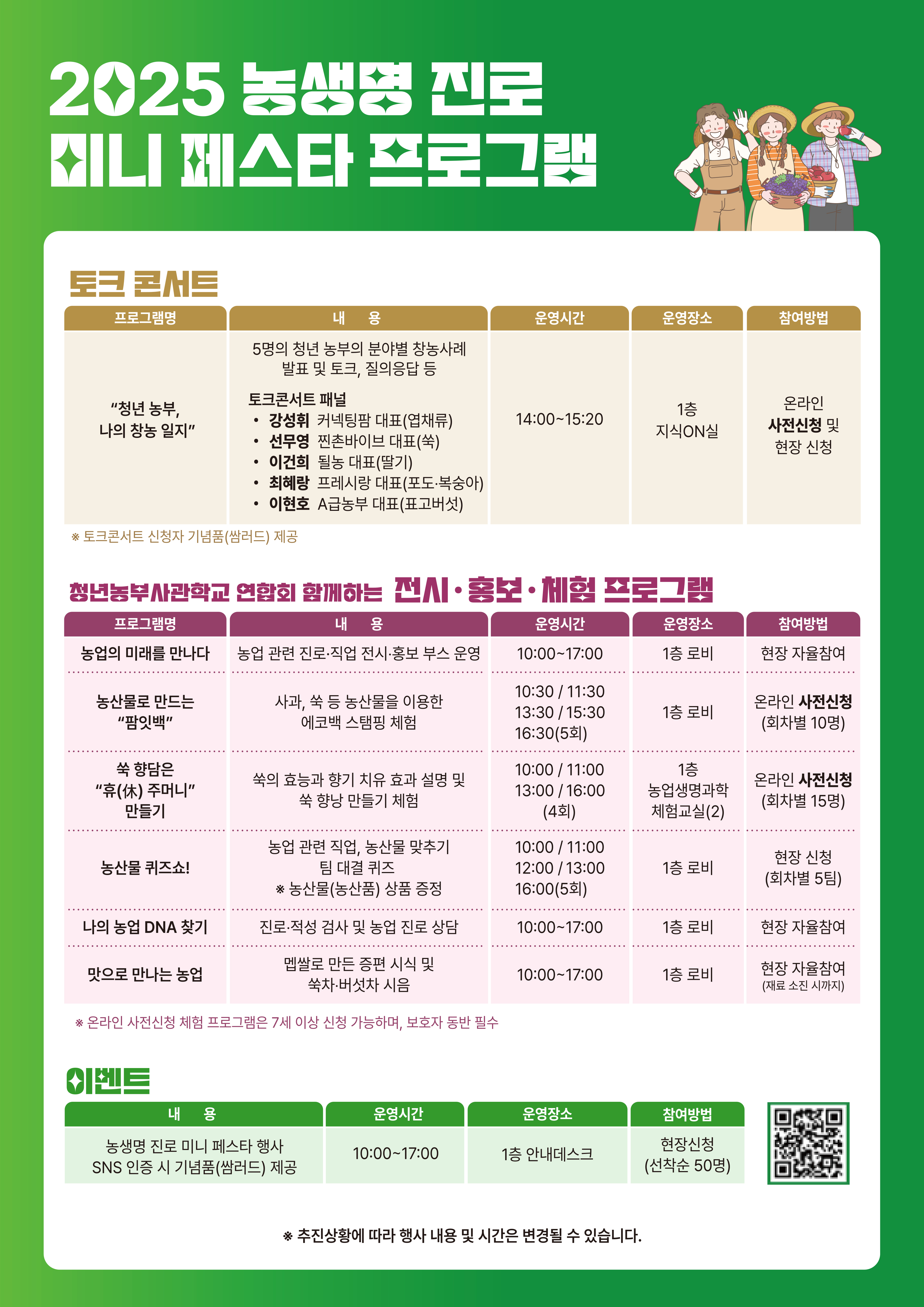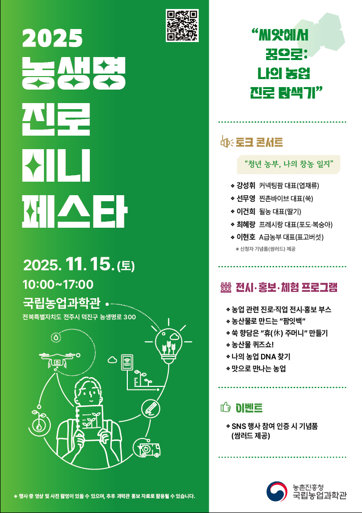 농촌진흥청 국립농업과학관에서 2025 농생명 진로 미니 페스타 행사를 진행합니다. 관심있는 학생들은 많은 참여 바랍니다.
