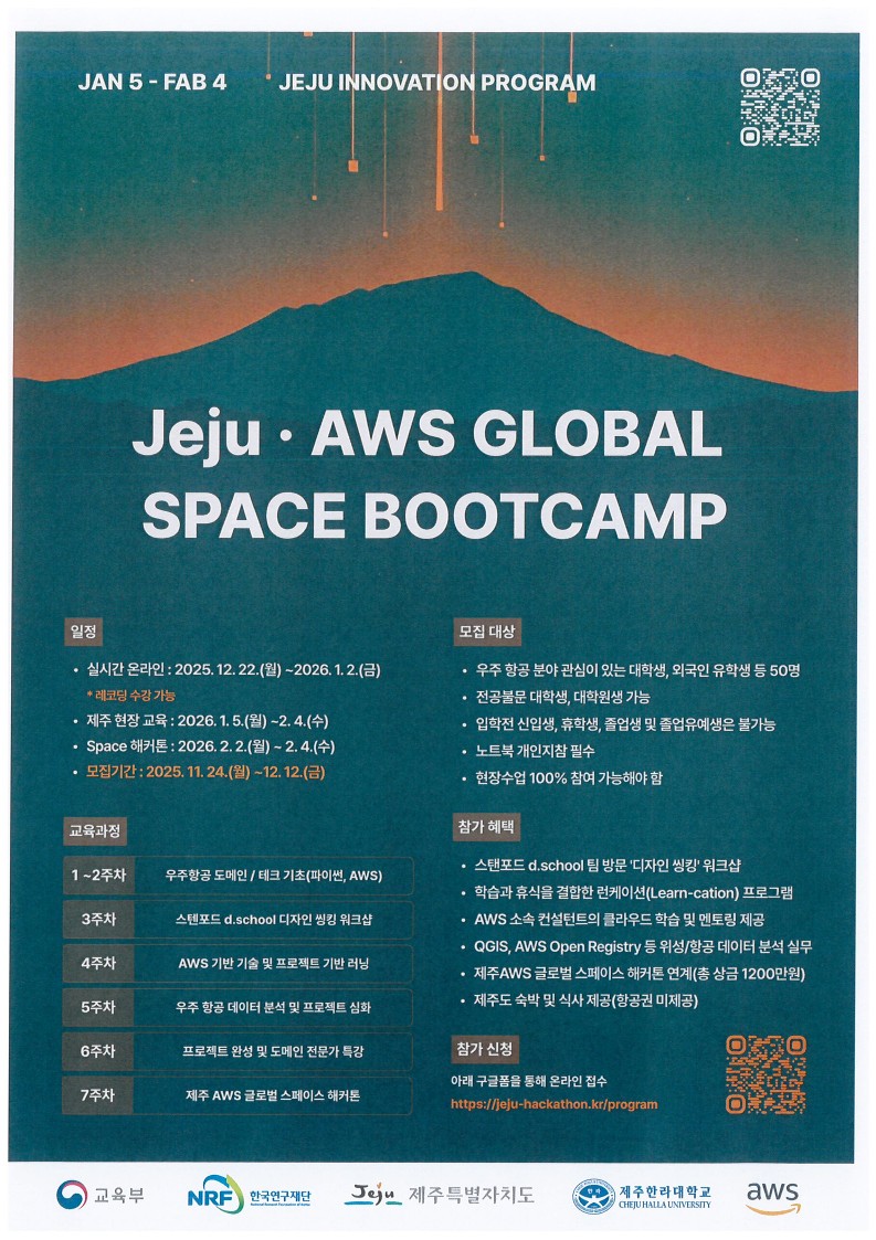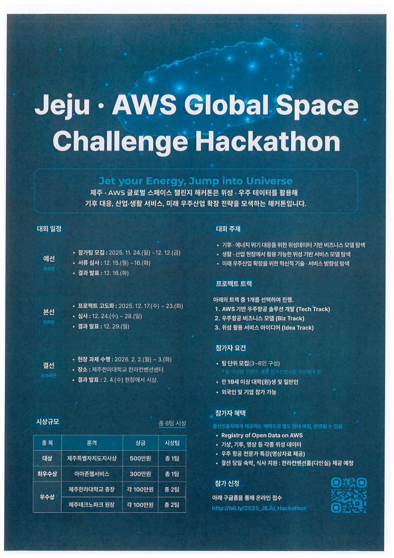 제주한라대학교에서 「Jeju Space Challenge」 부트캠프·해커톤 참가자를 모집합니다. 관심있는 학생들은 많은 참여 바랍니다.