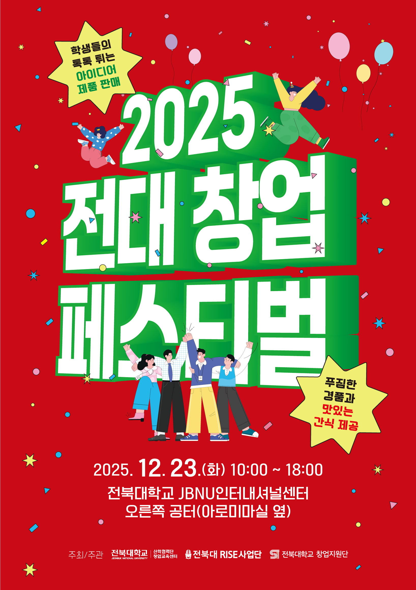 전북대학교 창업동아리 및 학생창업기업이 직접 기획·제작한 제품을 선보이는 「2025 전대 창업 페스티벌」**을 다음과 같이 개최하오니 학생 여러분의 많은 관심과 참여 바랍니다.