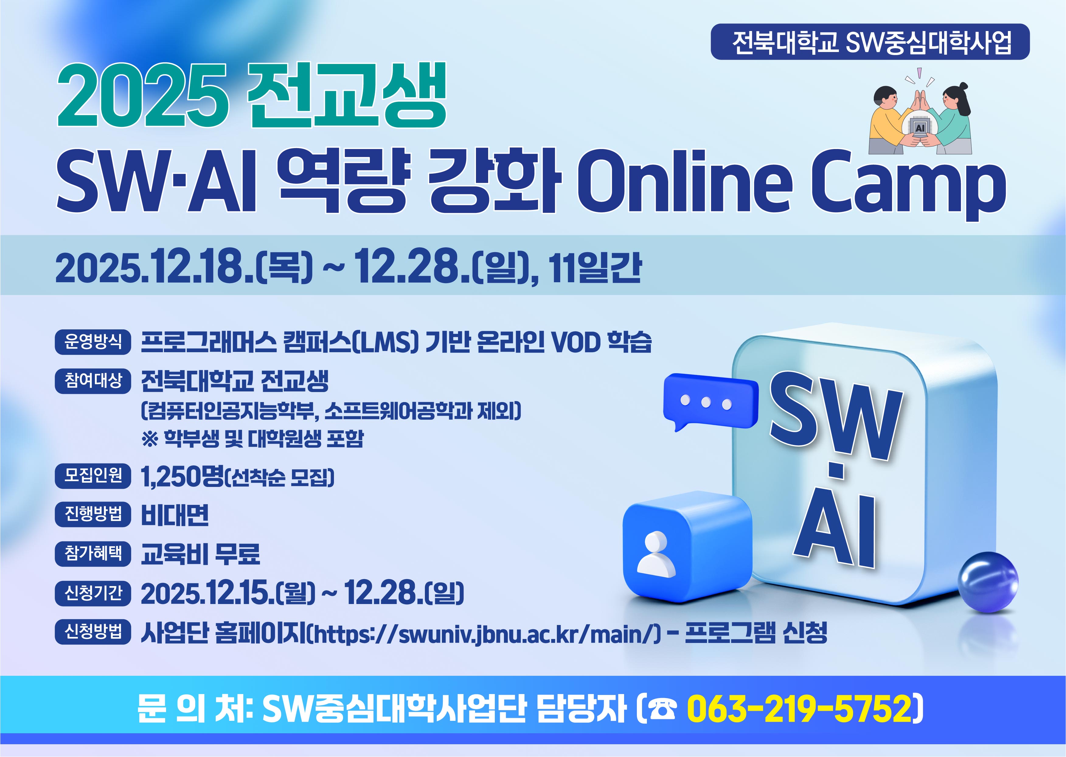 전북대학교 SW중심대학사업단에서는 전교생들에게 SW·AI 역량 강화를 위한 Online Camp를 진행하고자 합니다.