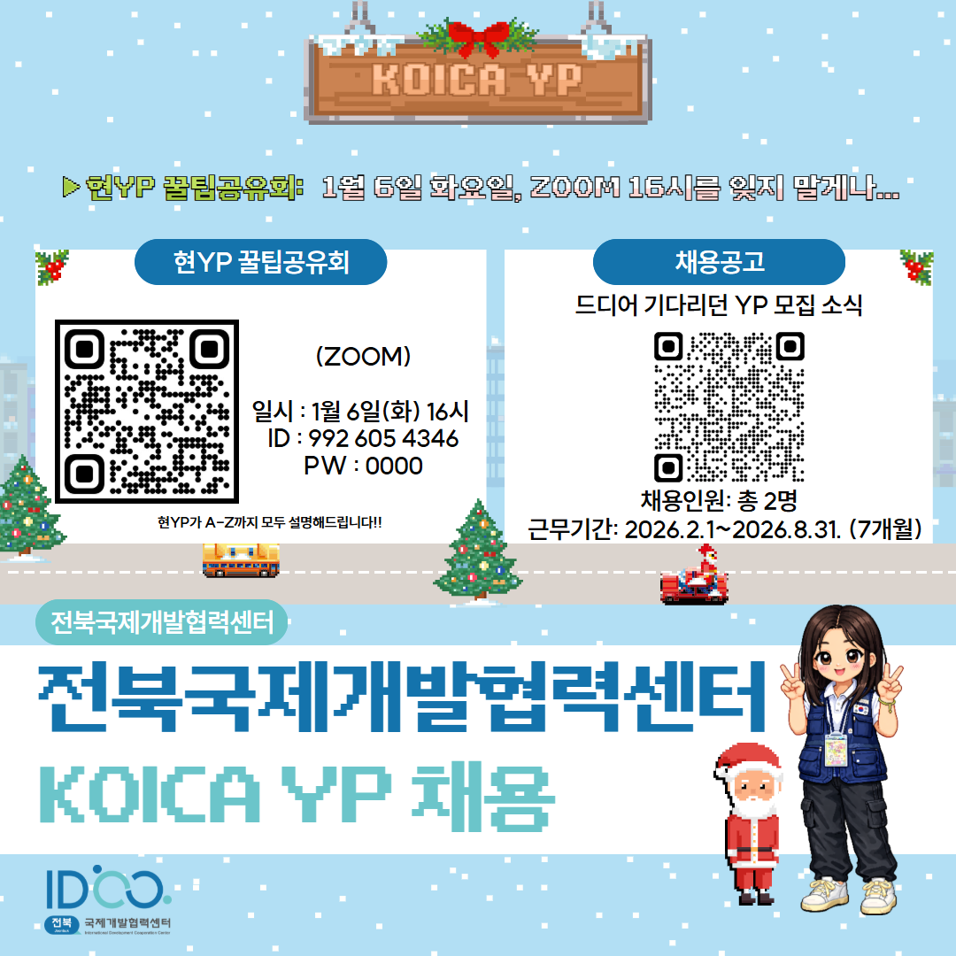 전북국제개발협력센터는 아래와 같이 2026년 상반기 KOICA 개발협력 사업수행기관 영프로페셔널(YP)을 모집합니다.