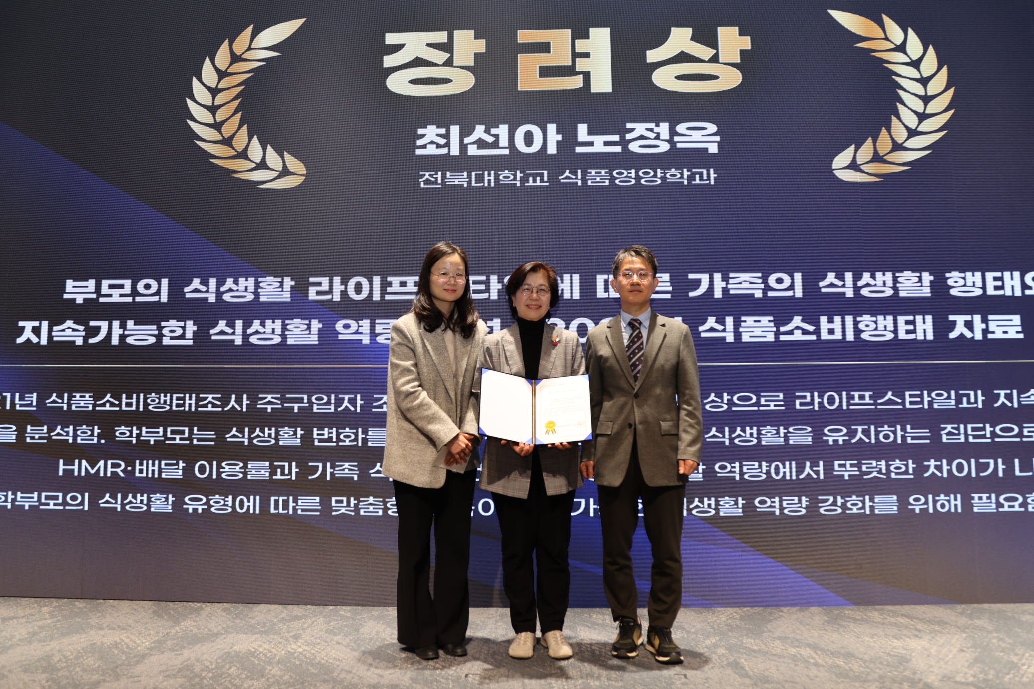 최선아 박사과정생은 “노정옥 교수님의 지도 아래 저탄소 채식 학교급식의 영양평가와 영양교육 방법을 주제로 연구할 수 있었고, 뜻깊은 상까지 받게 돼 기쁘다”고 소감을 밝혔다.