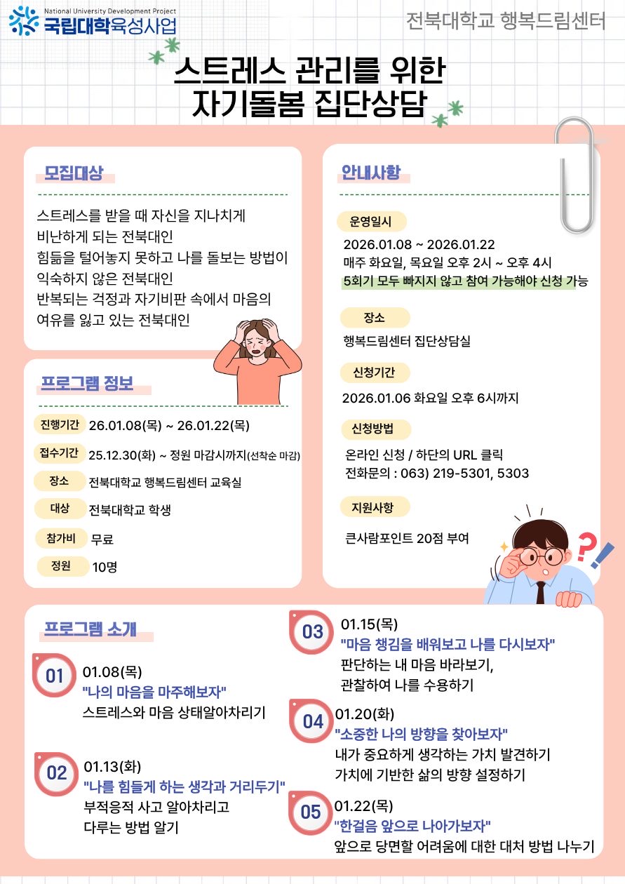 - 신청방법 : 행복드림센터 홈페이지 신청, 스트레스 관리 집단상담 신청하러 가기