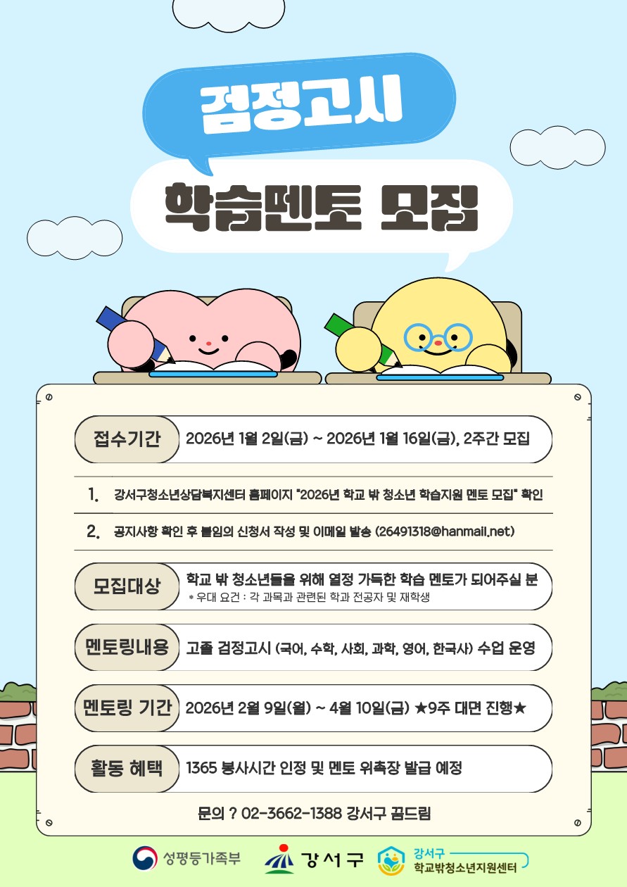 강서구청소년상담복지센터에서 학교 밖 청소년 학습지도(검정고시) 멘토를 모집합니다. 관심있는 학생들의 참여 바랍니다.