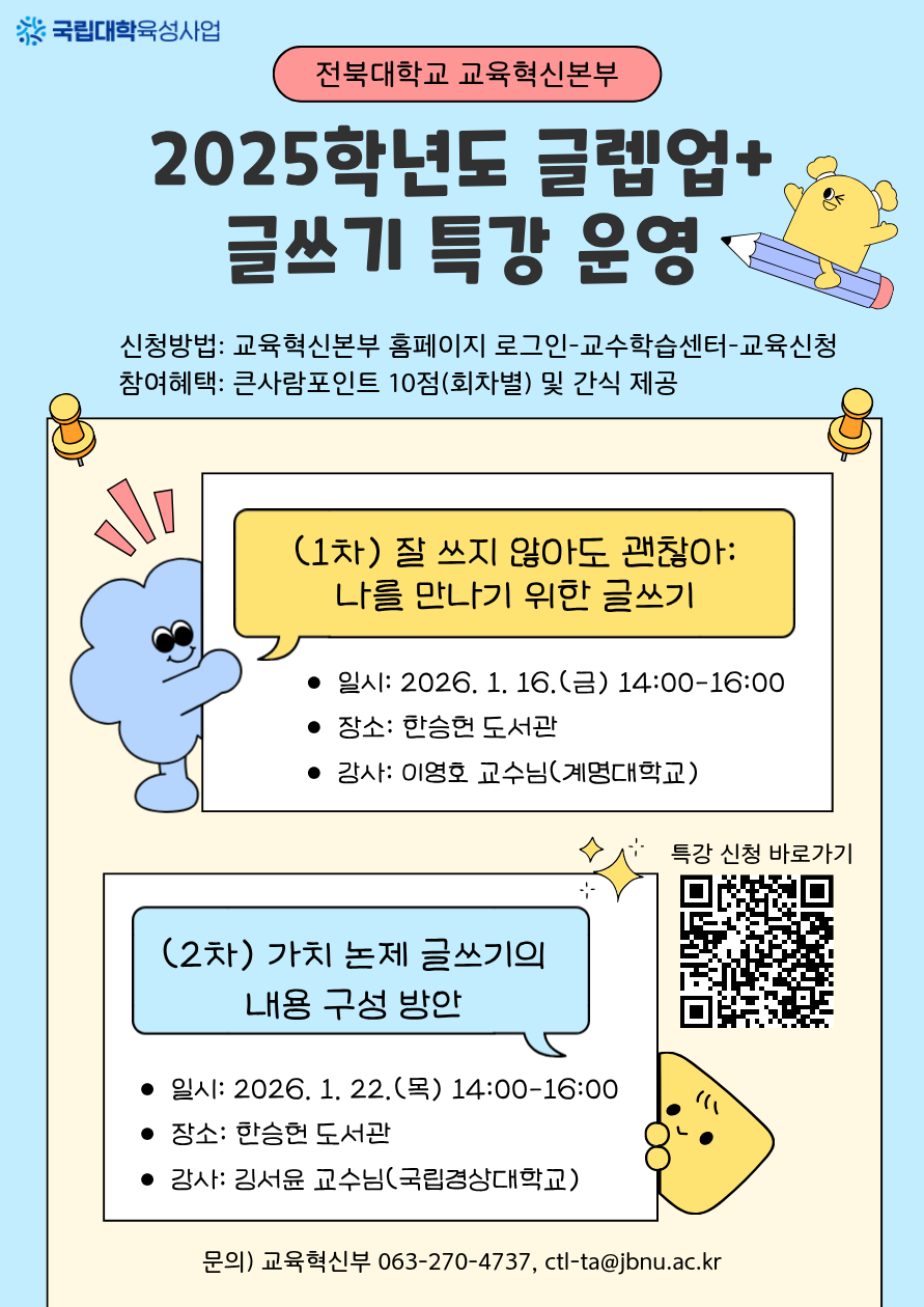 국립대학육성사업의 일환으로 학생들의 의사소통 능력 향상 및 체계적인 글쓰기 기회 제공을 위하여 「글렙업(글쓰기 실력 레벨업)+」 프로그램에서 아래와 같이 글쓰기 특강을 진행하고자 하오니, 관심있는 학생들의 많은 참여 바랍니다.