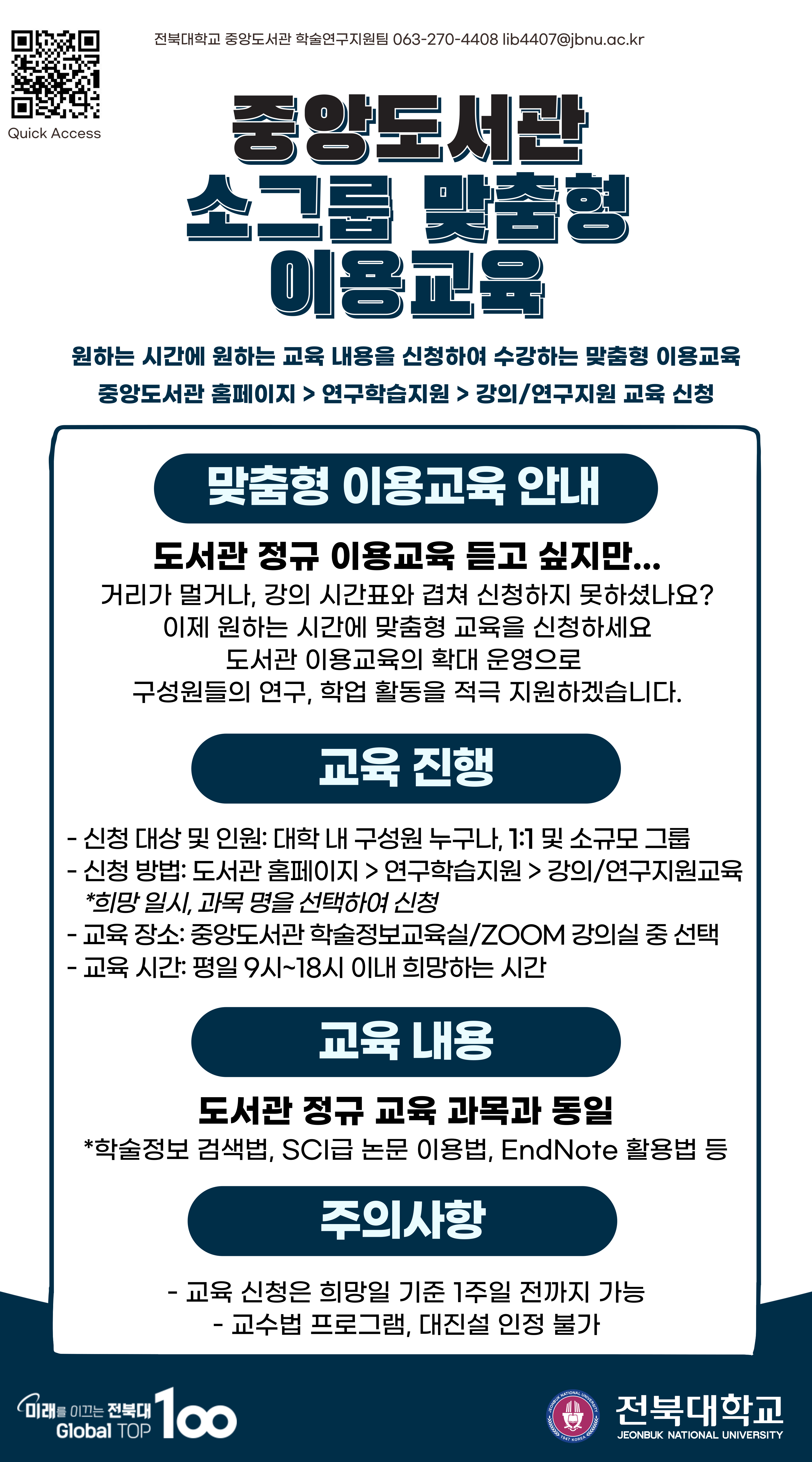 4. 교육문의: 중앙도서관 학술연구지원팀(270 4408, lib4407@jbnu.ac.kr)