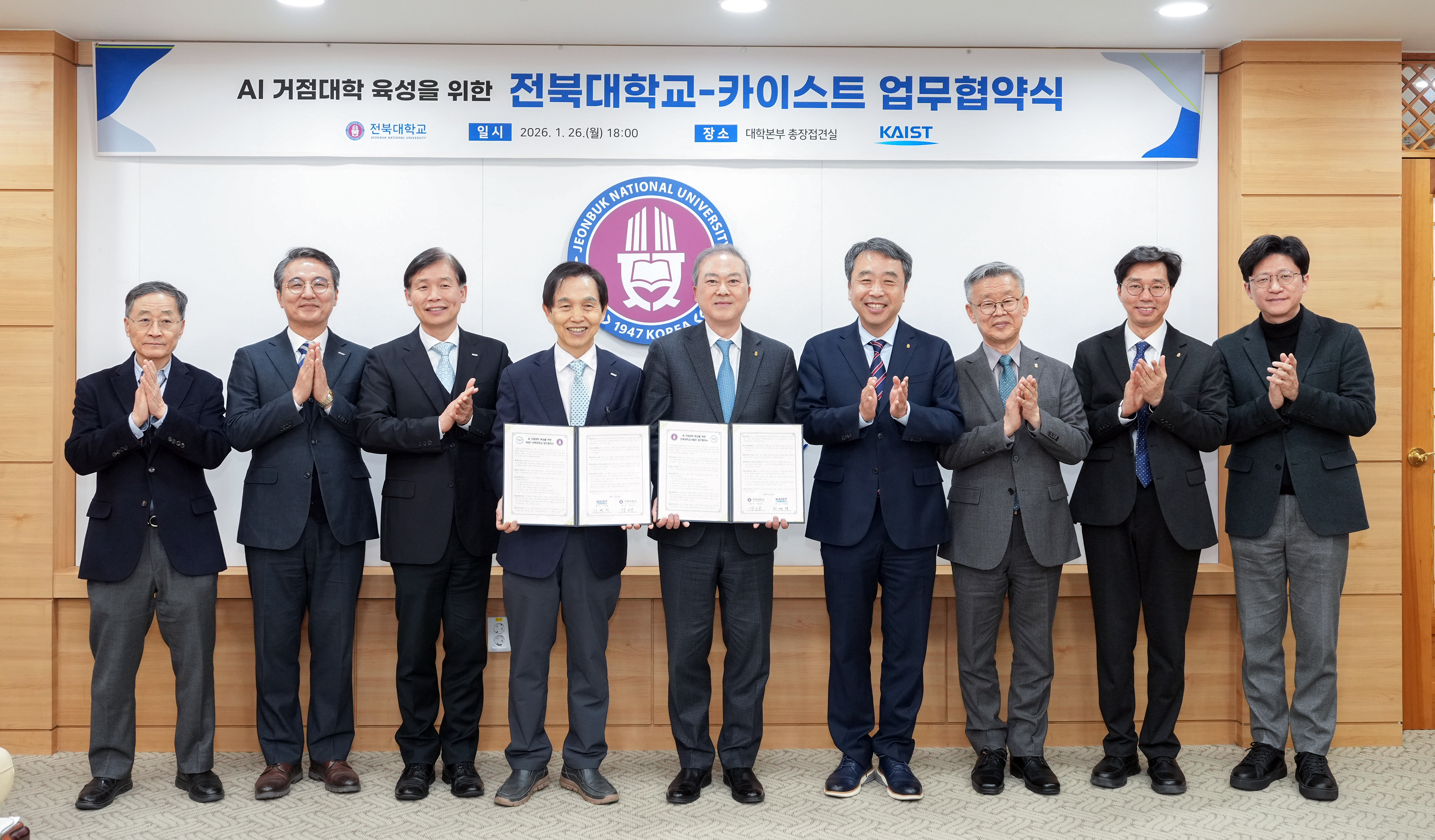 전북대는 26일(월) 오후 6시 대학본부에서 카이스트와 ‘AI 거점대학 육성을 위한 업무협약(MOU)’을 체결하고, AI 분야 인재양성과 연구 경쟁력 제고를 위한 협력 체계를 구축하기로 했다.