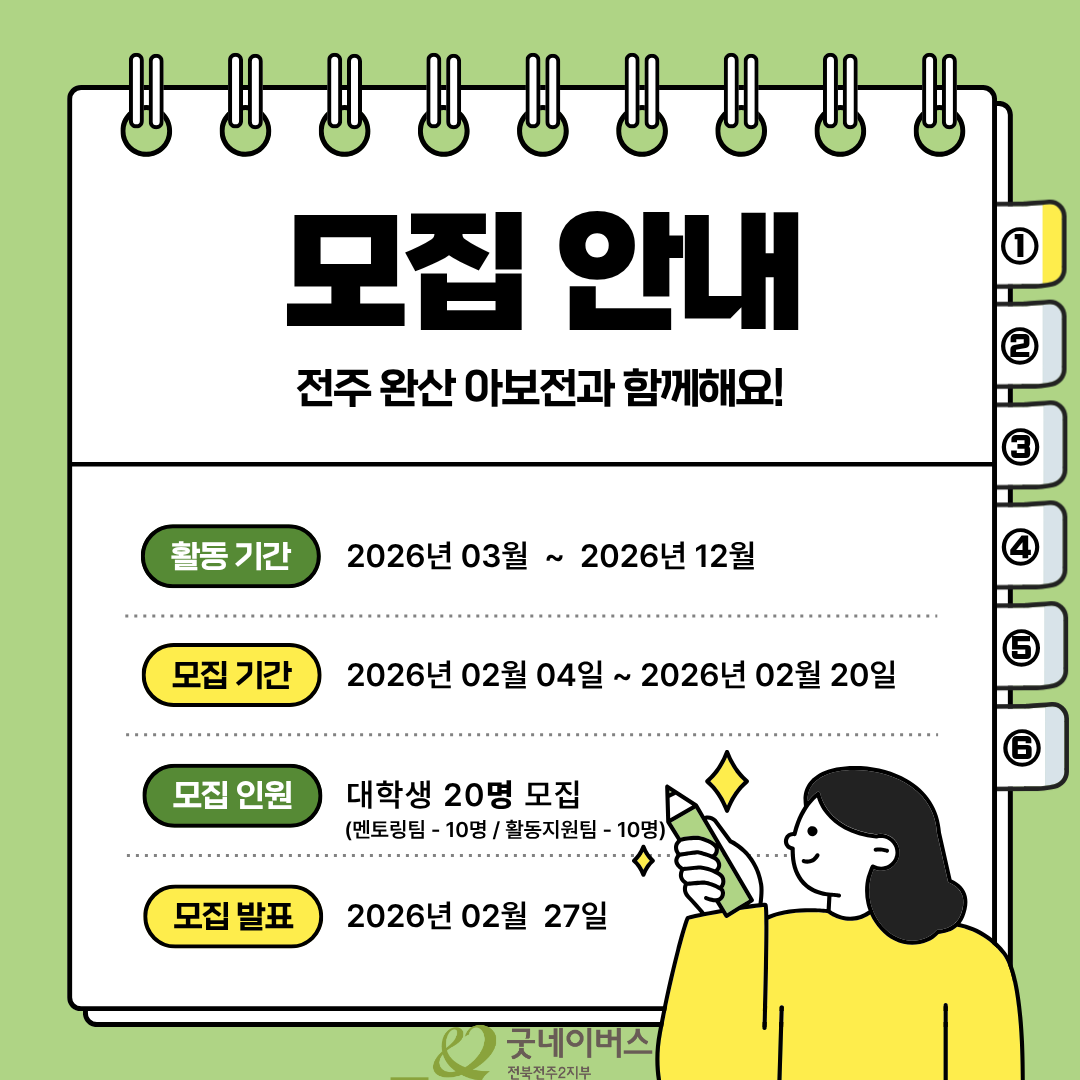 2026๋…„ ํ•œ ํ•ด ๋™์•ˆ, ์ „์ฃผ์‹œ ๋‚ด ์•„๋™๋“ค์˜ ๊ถŒ๋ฆฌ์ฆ์ง„์„ ์œ„ํ•ด ๋‹ค์–‘ํ•œ ์‚ฌ์—…๊ณผ ํ™œ๋™์„ ์ง€์›ํ•˜๊ณ , ์ฐธ์—ฌํ•˜๋Š” ์ž์›๋ด‰์‚ฌ์ž ์กฐ์ง์ธ '์•„๋™๊ถŒ๋ฆฌ์˜นํ˜ธ์„œํฌํ„ฐ์ฆˆ๋‹จ'์„ ๋ชจ์ง‘ํ•˜๊ณ ์ž ํ•ฉ๋‹ˆ๋‹ค.