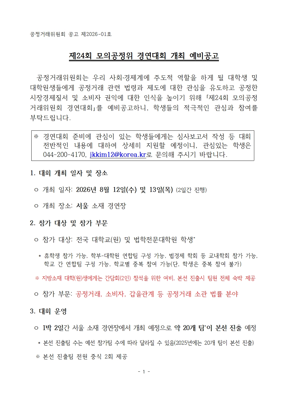 공정거래위원회에서 제24회 대학(원)생 모의 공정거래위원회 경연대회를 개최합니다. 관심있는 학생들의 많은 참여 바랍니다.
