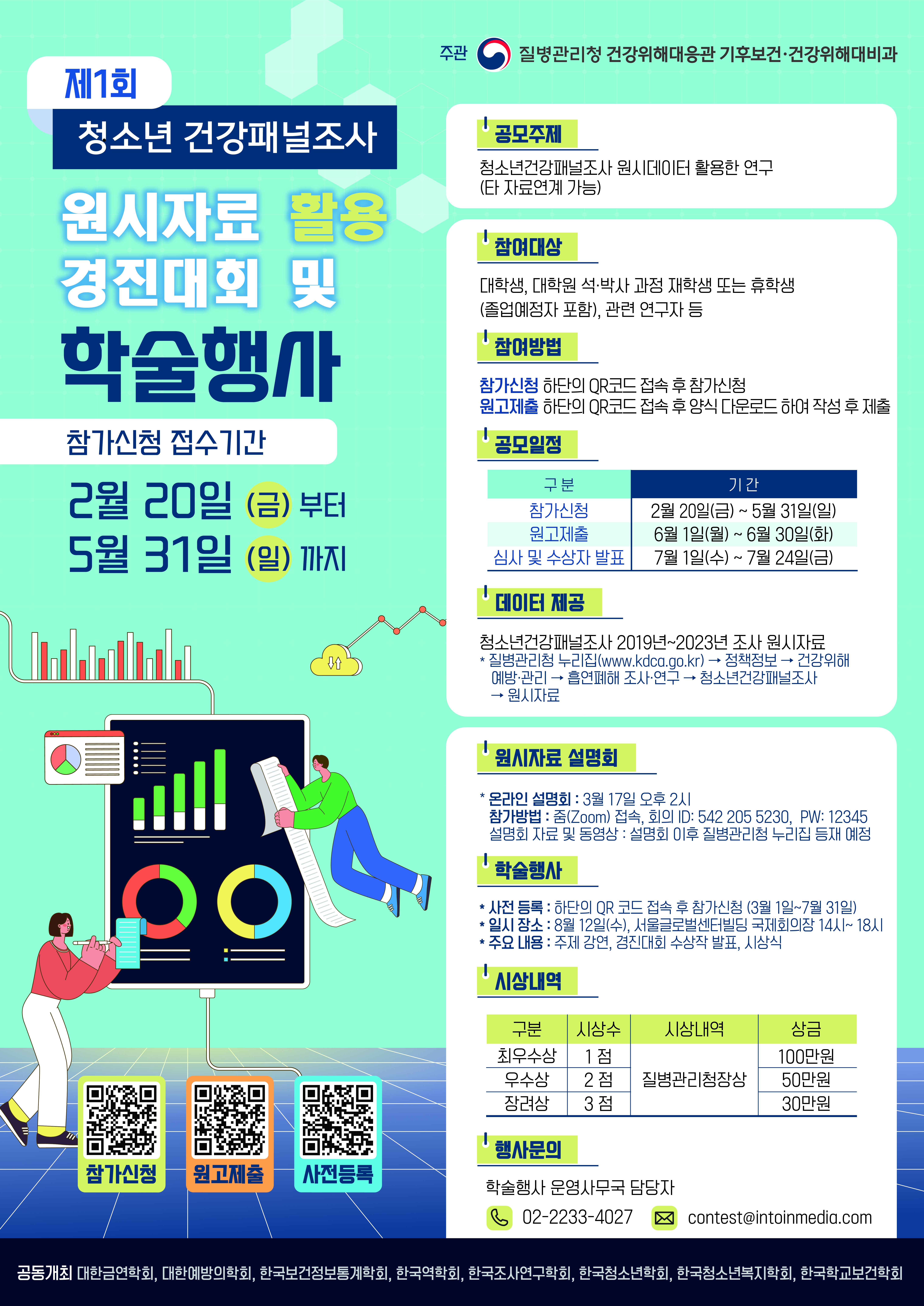 질병관리청에서 제1회 청소년건강패널조사 원시자료 활용 경진대회 및 학술행사를 개최합니다. 관심있는 학생들의 참여 바랍니다.