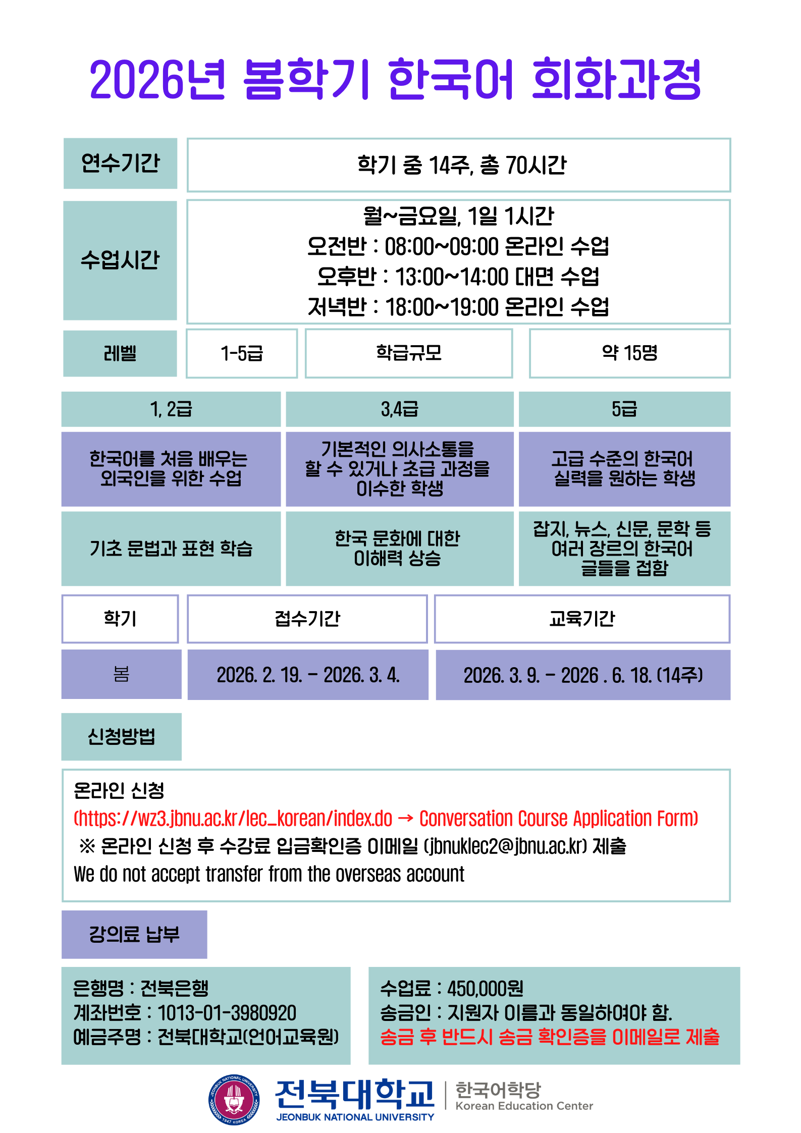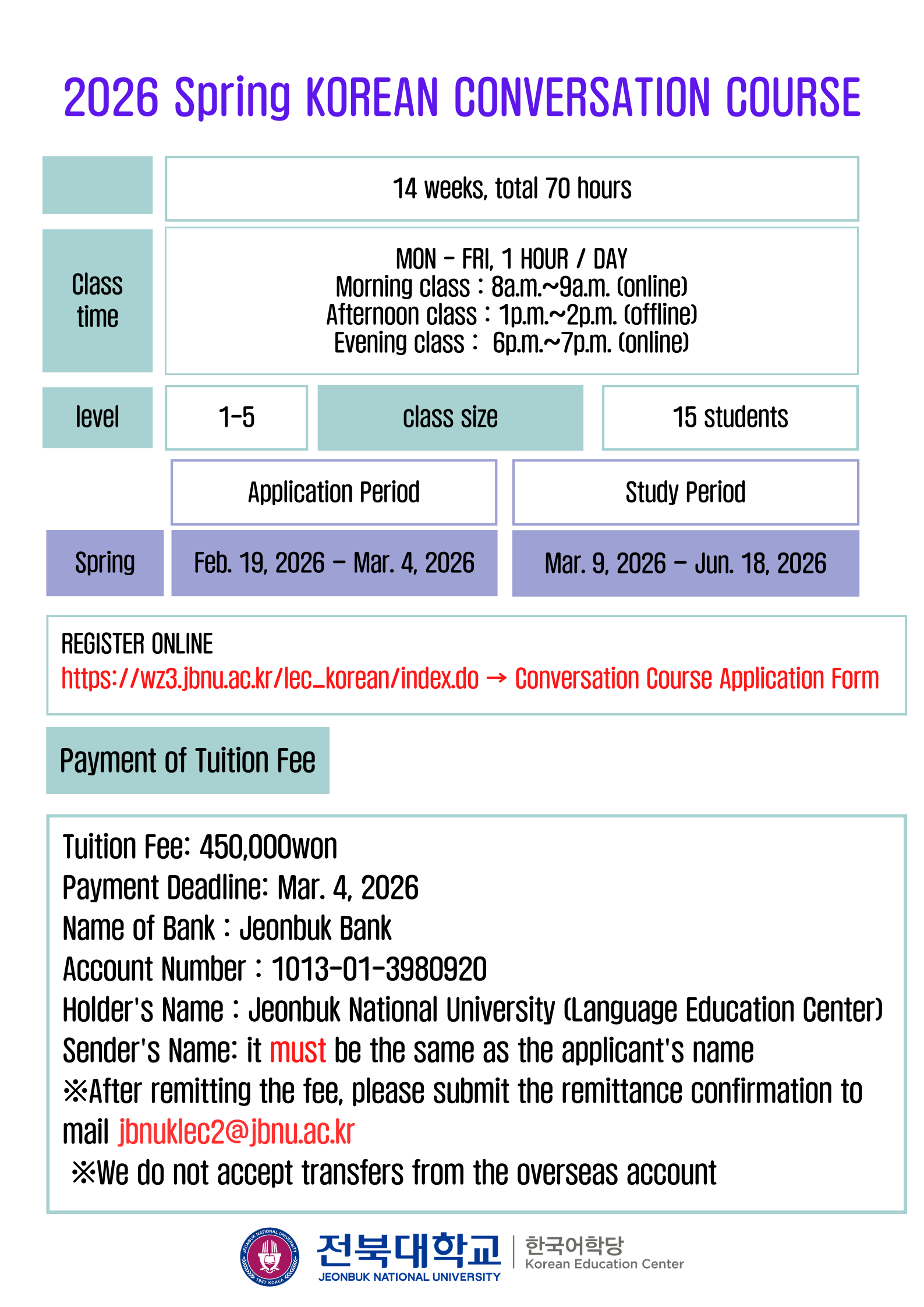After completing the payment, please send the receipt to our email: jbnuklec2@jbnu.ac.kr