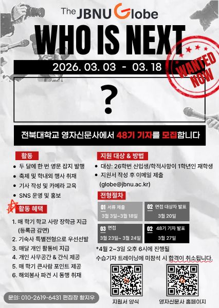 문의사항: 010-2619-6431 황지우 편집장 , 인스타그램: @jbnu_globe 문의