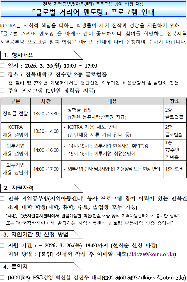 안녕하세요? KOTRA에서 지역아동센터 봉사 대학생 대상 「글로벌 커리어 멘토링」 참여 학생을 모집하고 있다고 하오니,