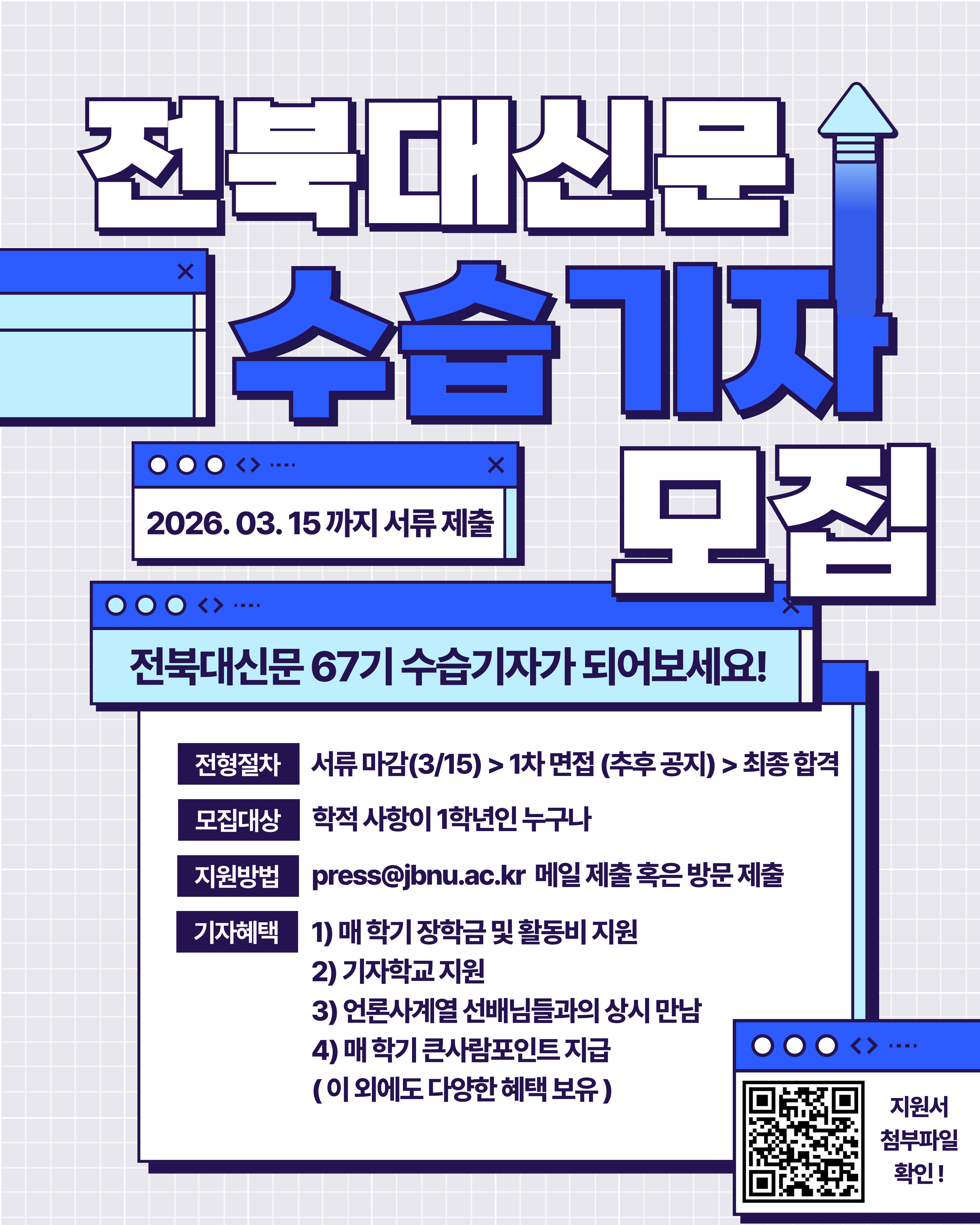 - 접수 방법: 지원서 작성 후 이메일(press@jbnu.ac.kr)로 발송 혹은 학생타운 2층 전북대신문 편집국 방문 제출