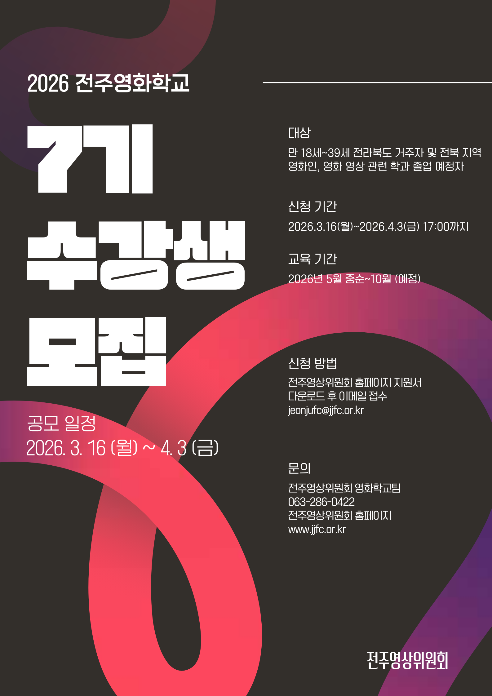 전주영상위원회에서 영화 연출 및 시나리오 창작 교육 프로그램 ‘전주영화학교 7기’ 수강생을 모집합니다. 관심 있는 분들의 많은 지원 바랍니다.