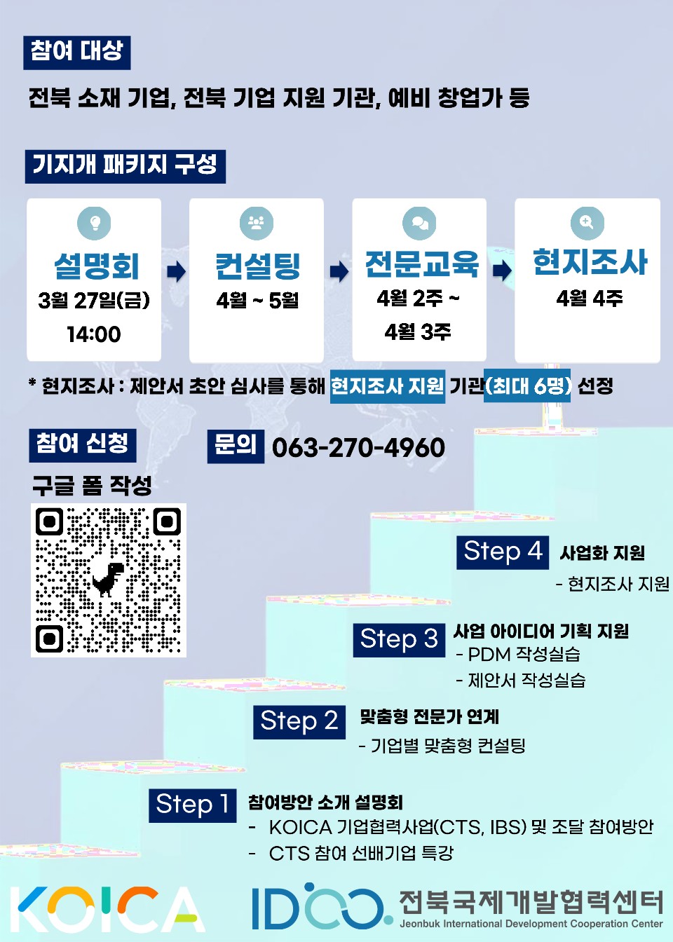 자세한 내용은 전북국제개발협력센터 블로그(https://blog.naver.com/jbidcc) 공지사항에서 확인할 수 있다. 문의(063-270-4960).