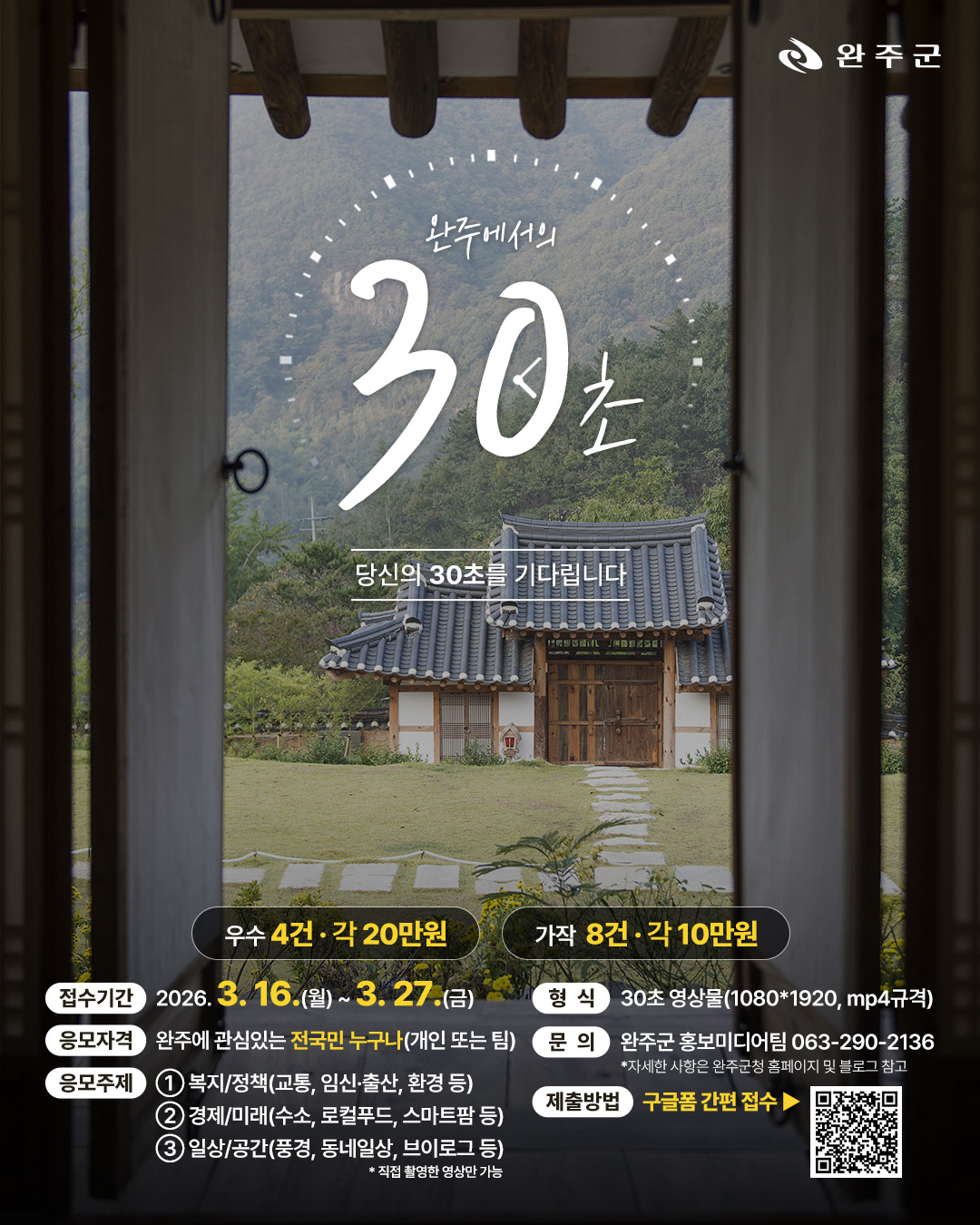 (완주군) 「완주에서의 30초」 2026 완주군 30초 홍보 영상 챌린지 안내